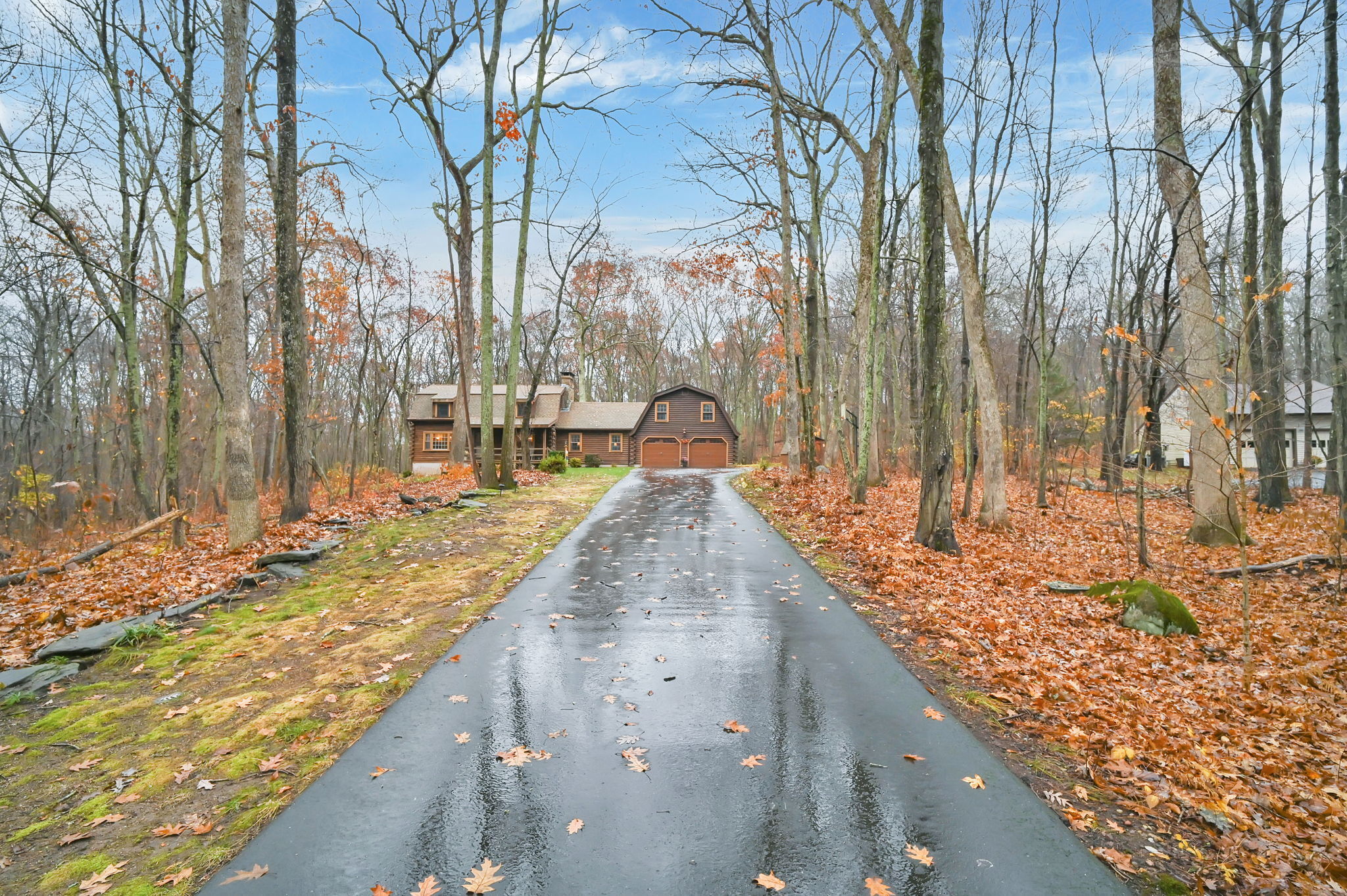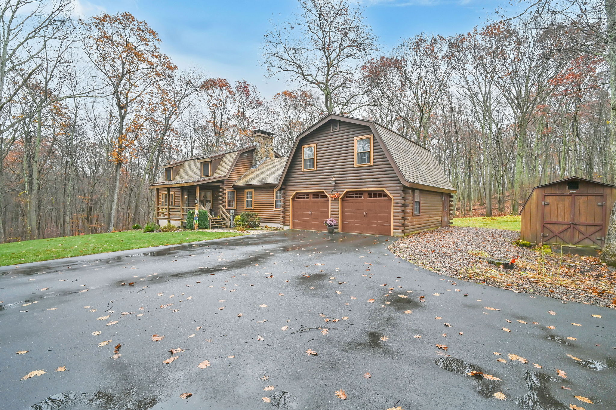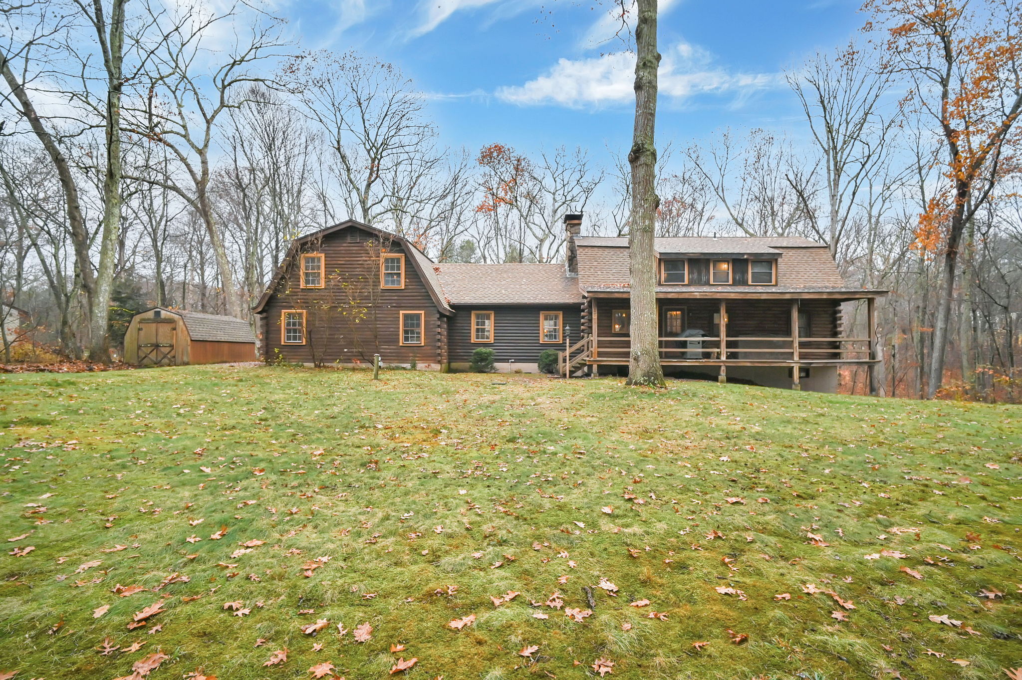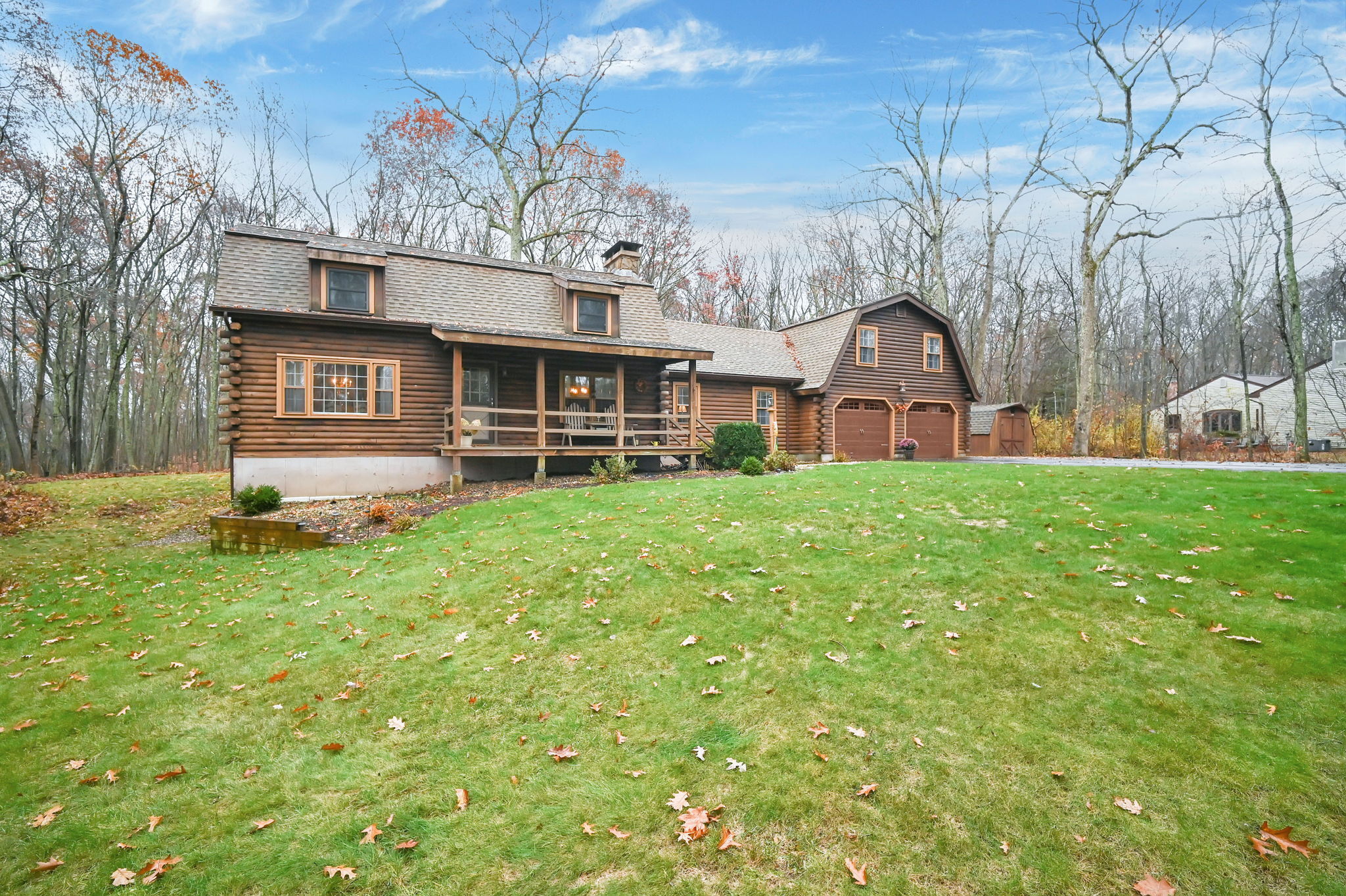 *Multiple Offers: Please submit offers by Monday, 11/17 at 12pm* Nestled on a quiet country road in a desirable subdivision, this log home offers rustic charm with retreat vibes that can be your everyday place to call home. Set on over an acre of wooded land and bordered by 217 acres of state forest, the property provides exceptional privacy and a serene natural backdrop. Inside, the warmth of exposed log walls and beams, and fieldstone fireplaces create a timeless country ambiance. The eat-in kitchen features a breakfast bar for casual meals and prep space. Around the corner is a spacious formal dining room perfect for hosting gatherings. The living room has impressive, yet cozy features such as a cathedral log ceiling, exposed beams, and 2-story fieldstone fireplace. The first floor also includes a versatile bedroom or office and a full bathroom. Upstairs are 3 bedrooms and a full bath, with the primary bedroom highlighted by the second stone fireplace and a spacious closet. Above the garage, a heated bonus room with a separate entrance presents endless possibilities - whether as a guest suite, in-law apartment, home office, or creative studio. The walkout lower level provides ample storage and laundry facilities. A paved, flat driveway leads to the attached two-car garage. The covered front and back porches extend the living space outdoors, ideal for relaxing or entertaining. Recent updates include newer boiler, oil tank, and well tank.