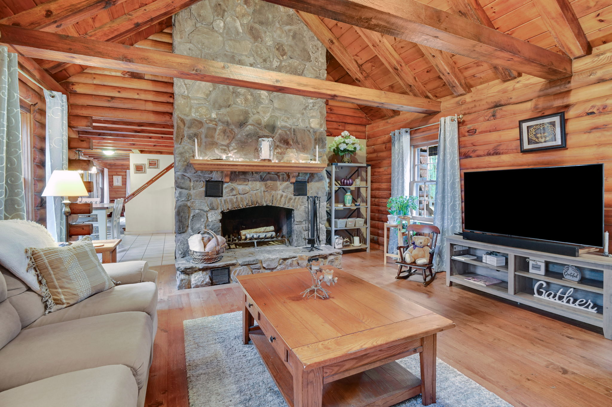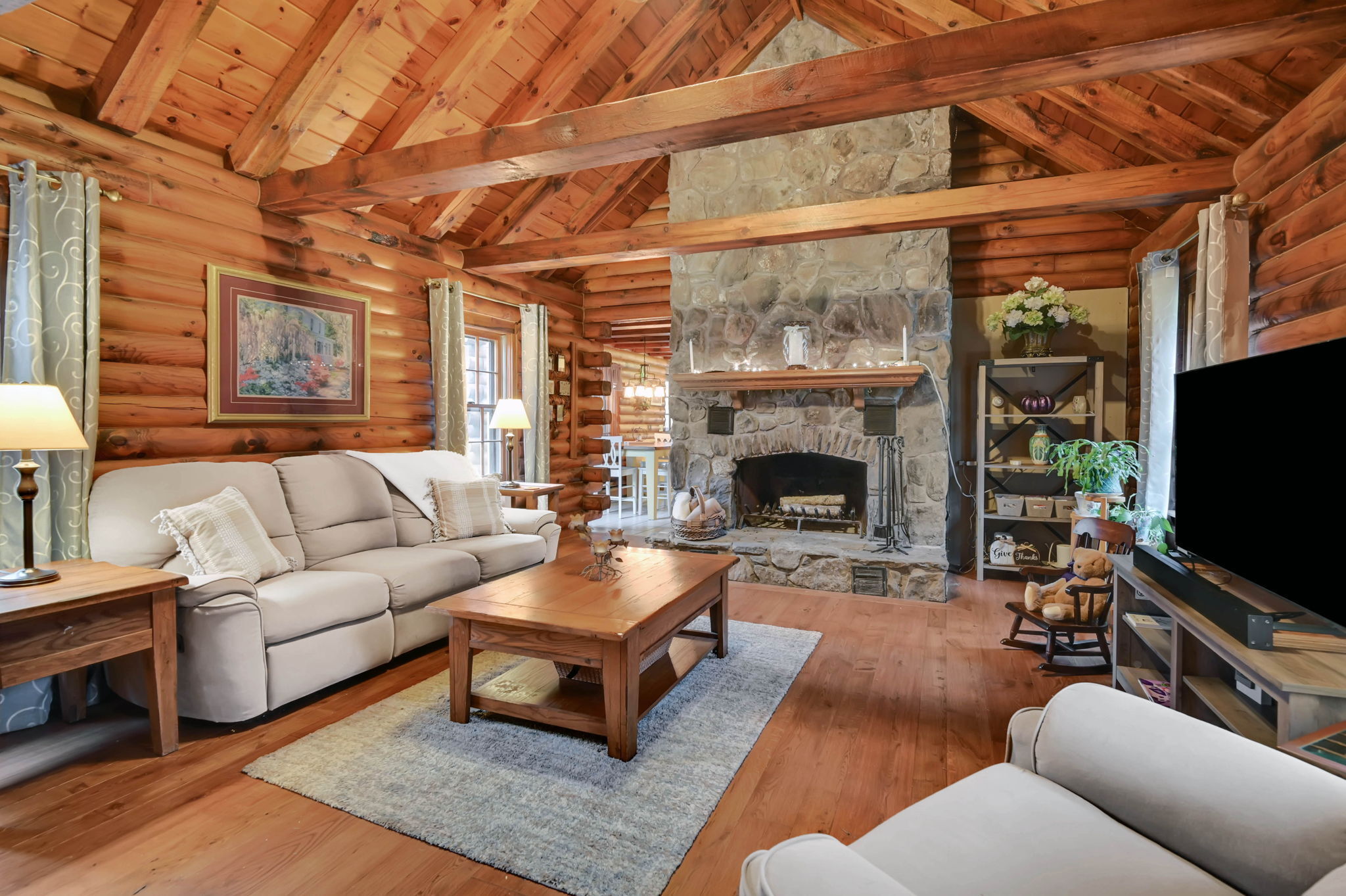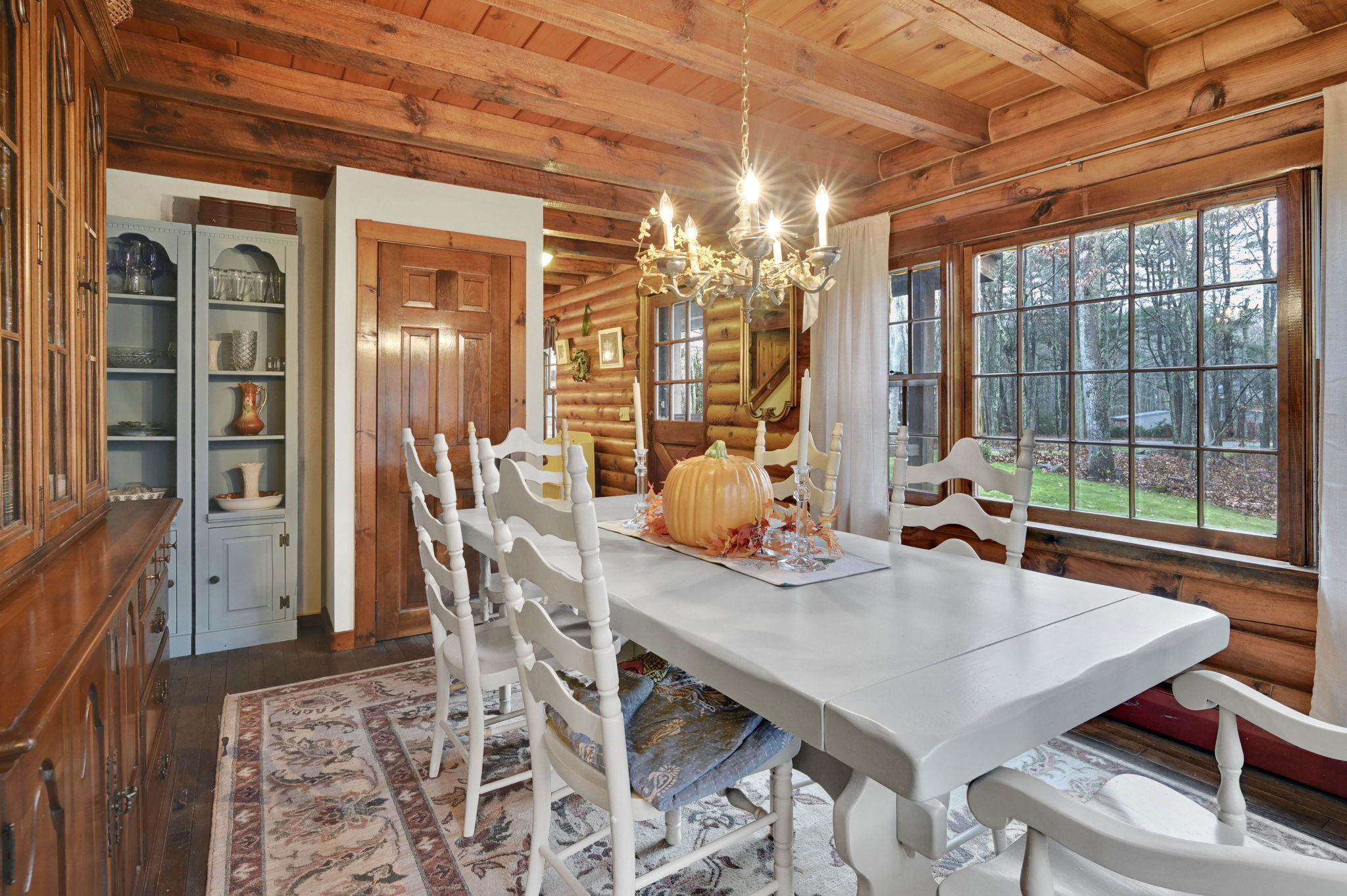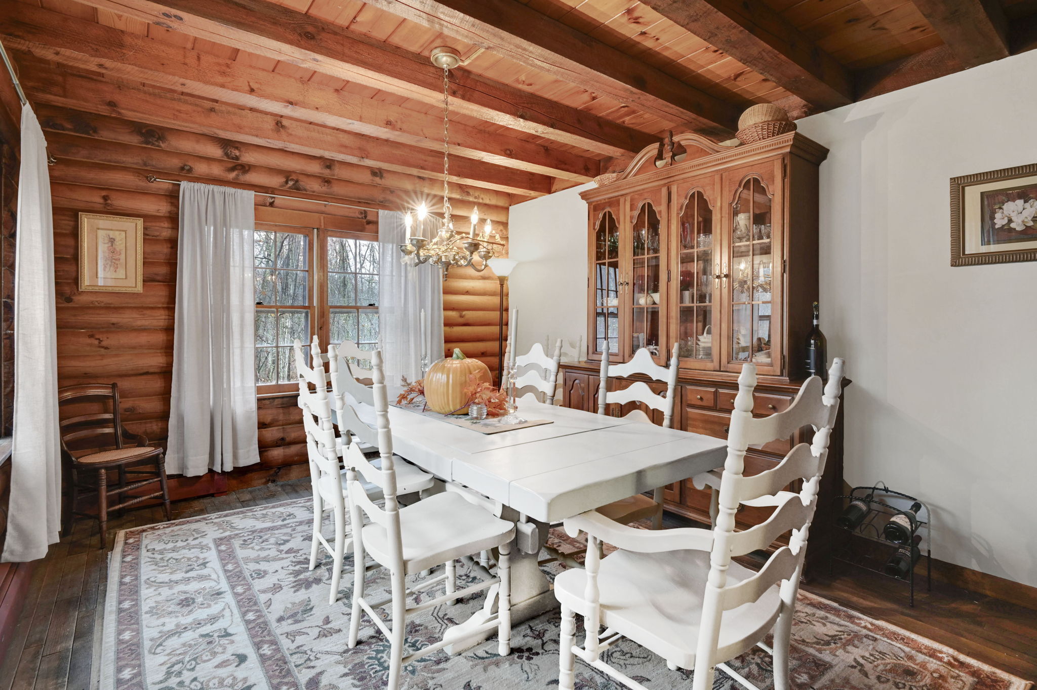 *Multiple Offers: Please submit offers by Monday, 11/17 at 12pm* Nestled on a quiet country road in a desirable subdivision, this log home offers rustic charm with retreat vibes that can be your everyday place to call home. Set on over an acre of wooded land and bordered by 217 acres of state forest, the property provides exceptional privacy and a serene natural backdrop. Inside, the warmth of exposed log walls and beams, and fieldstone fireplaces create a timeless country ambiance. The eat-in kitchen features a breakfast bar for casual meals and prep space. Around the corner is a spacious formal dining room perfect for hosting gatherings. The living room has impressive, yet cozy features such as a cathedral log ceiling, exposed beams, and 2-story fieldstone fireplace. The first floor also includes a versatile bedroom or office and a full bathroom. Upstairs are 3 bedrooms and a full bath, with the primary bedroom highlighted by the second stone fireplace and a spacious closet. Above the garage, a heated bonus room with a separate entrance presents endless possibilities - whether as a guest suite, in-law apartment, home office, or creative studio. The walkout lower level provides ample storage and laundry facilities. A paved, flat driveway leads to the attached two-car garage. The covered front and back porches extend the living space outdoors, ideal for relaxing or entertaining. Recent updates include newer boiler, oil tank, and well tank.