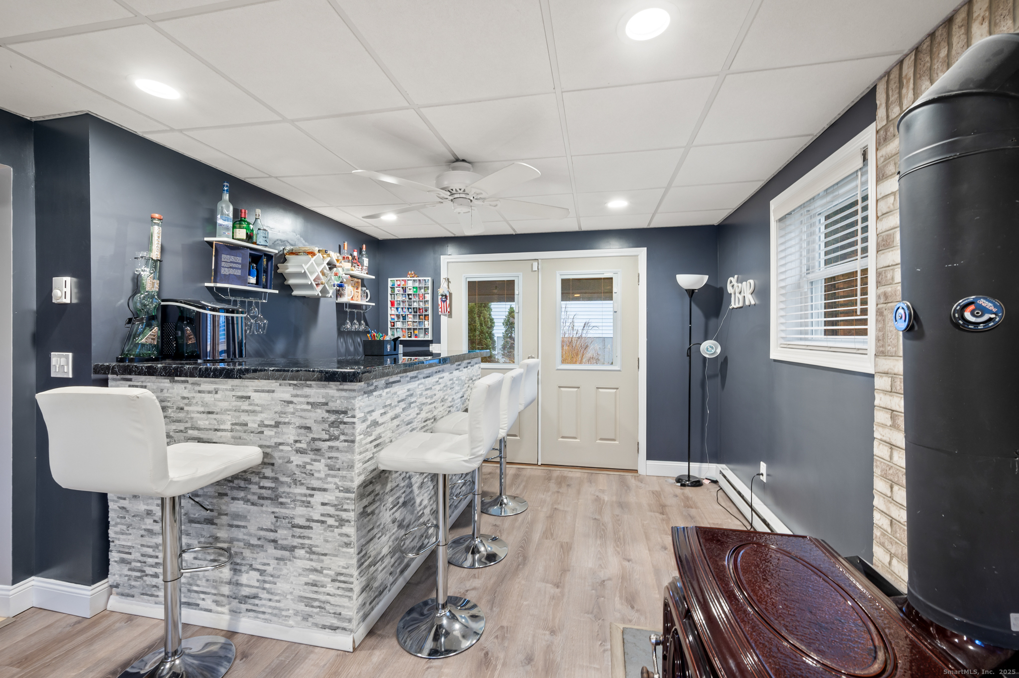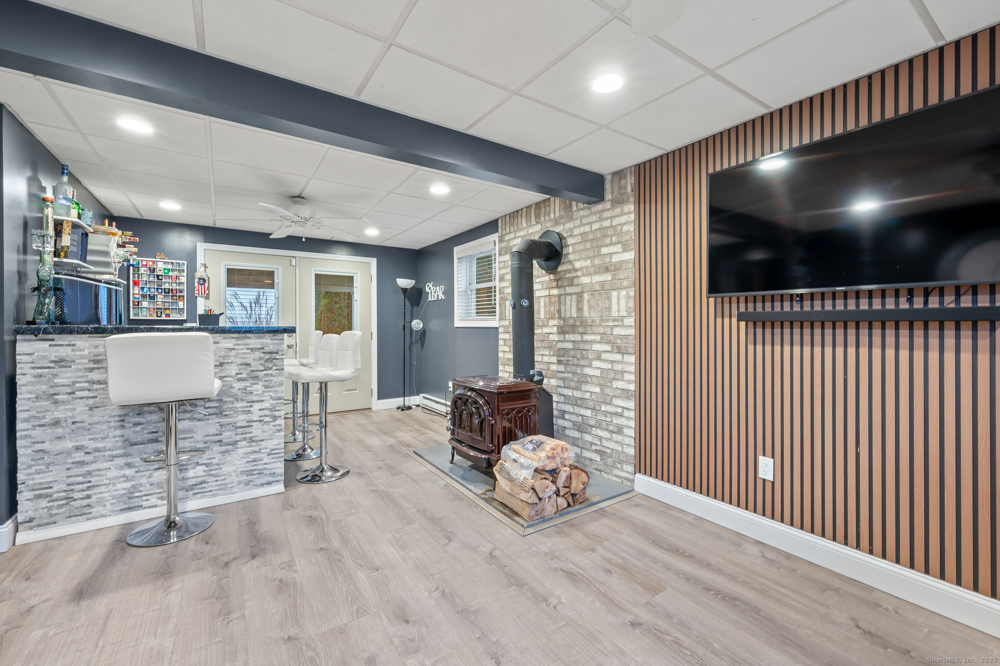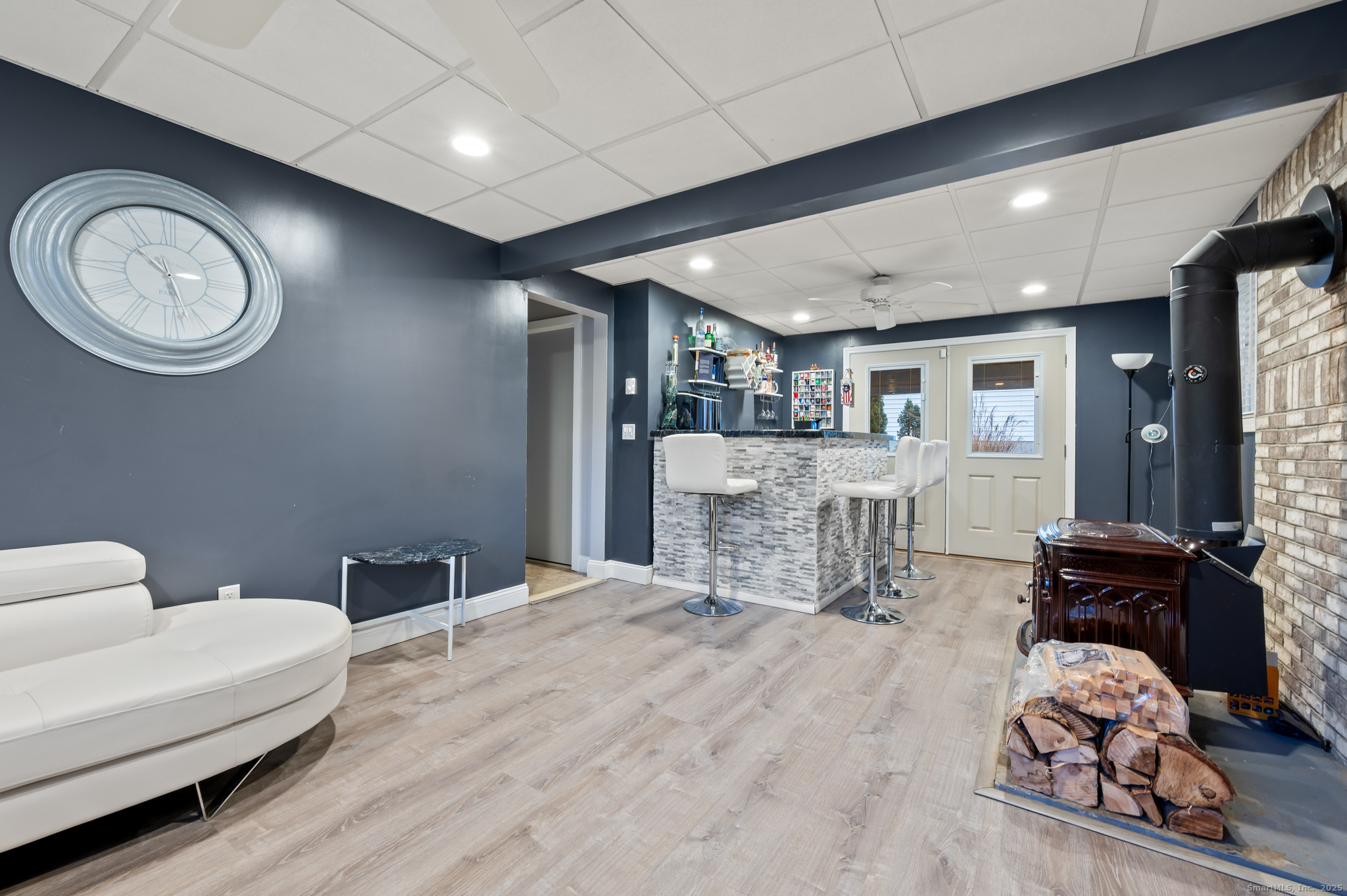 Step into this beautifully updated and meticulously maintained home offering 3 bedrooms and 1 full bathroom on the upper level. Enjoy an open floor plan filled with natural light, hardwood floors throughout, and central air to keep you cool all summer long. The newly updated eat-in kitchen features brand-new cabinets and stainless steel appliances, seamlessly connecting to the main living area. The walk-out lower level is perfect for entertaining, offering a spacious family room with NEW flooring, a wood stove, a convenient half bath, and a built-in bar. From here, step right out to the patio for easy indoor-outdoor living. The exterior is just as impressive with a fully fenced yard, a shed for extra storage, and a beautiful deck ideal for gatherings, grilling, and relaxation. Car enthusiasts will love the finished garage with epoxy flooring and heating powered by natural gas. Solar panels were added last year, providing energy efficiency and long-term savings. This home truly checks every box-come see all it has to offer!