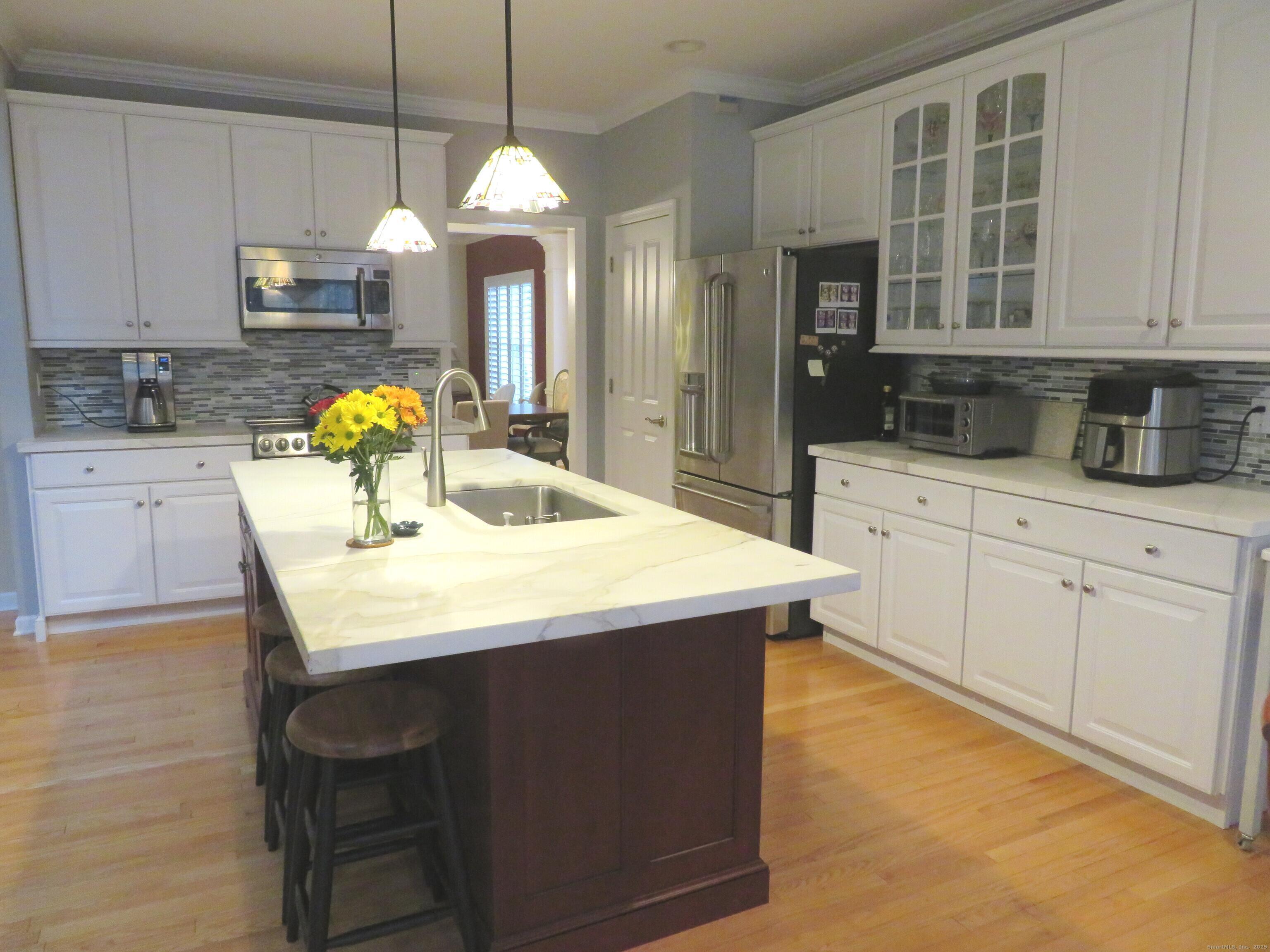 Exceptional offering in the highly desirable community of Cheshire Crossing! Elegant 2 story entry foyer, 1st floor office, classic open living room and dining room defined by decorative columns. Gracious 2 story Family room has propane fireplace w marble hearth and is flanked by two windows. The beautifully remodeled and fully applianced kitchen features honed marble island and counters, tiled backsplash, recessed lighting, hardwood floor with tiled inlay, windowed eating area and slider leading to expanded, oversized, maintenance free trex style deck overlooking, tranquil, private wooded setting. First floor master suite has trayed ceiling and french doors to spacious remodeled, tiled bath with two sinks and large walk-in customized closet. First floor laundry with new washer, dryer with has 2 generous closets and built-ins. Second floor with 2 generous bedrooms, loft and full bath. Lower level has exercise area, game room is incredibly finished for all your family's fun and needs- 957 sf finished! Upgrades include propane line for grill, automatic propane generator, gutter helmets, 3rd zone heat and ac for master suite. First floor with plantation shutters, crown molding. New garage door opener and built in storage cabinet. New hot water heater. 2nd refrigerator and some shelving will stay in basement.