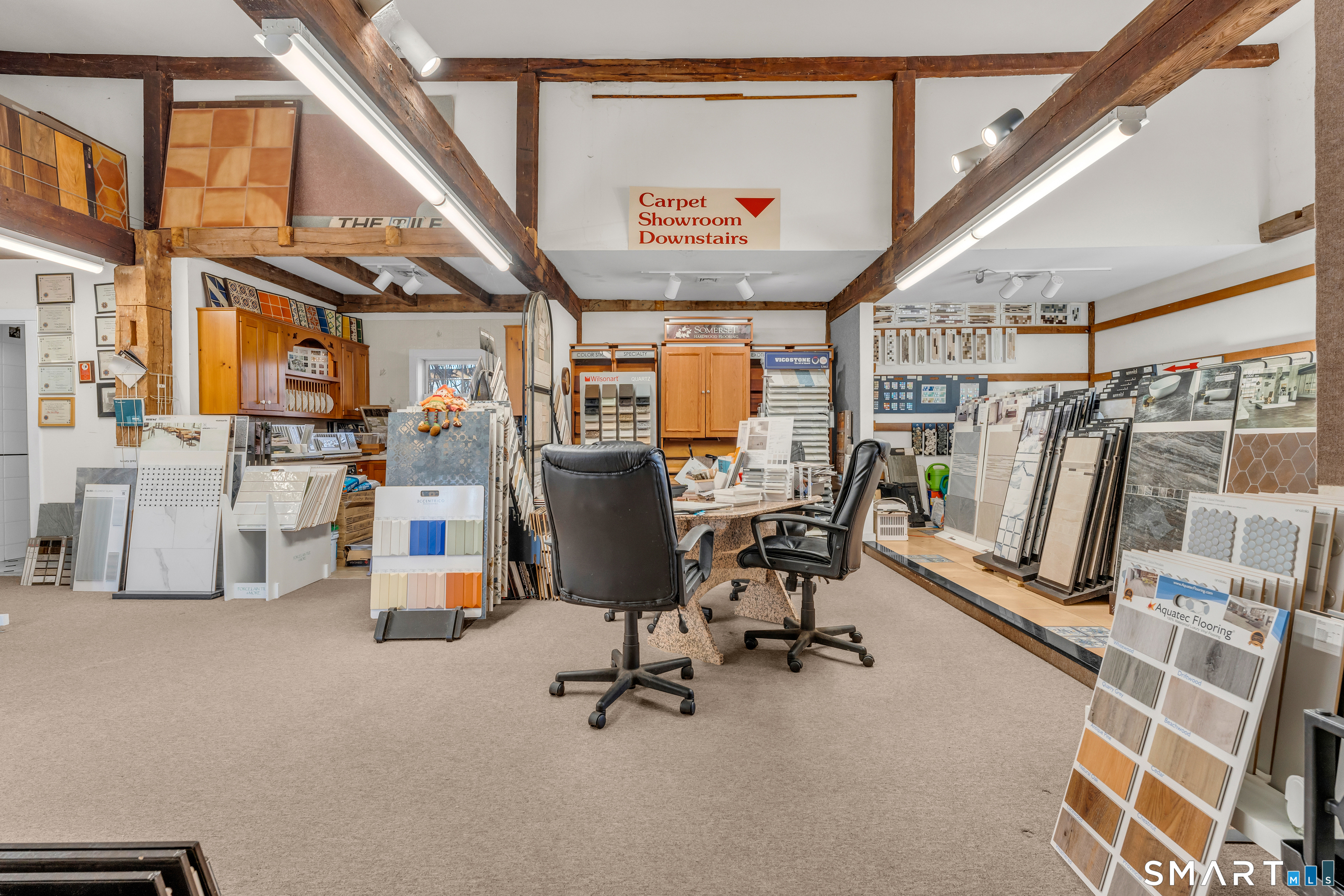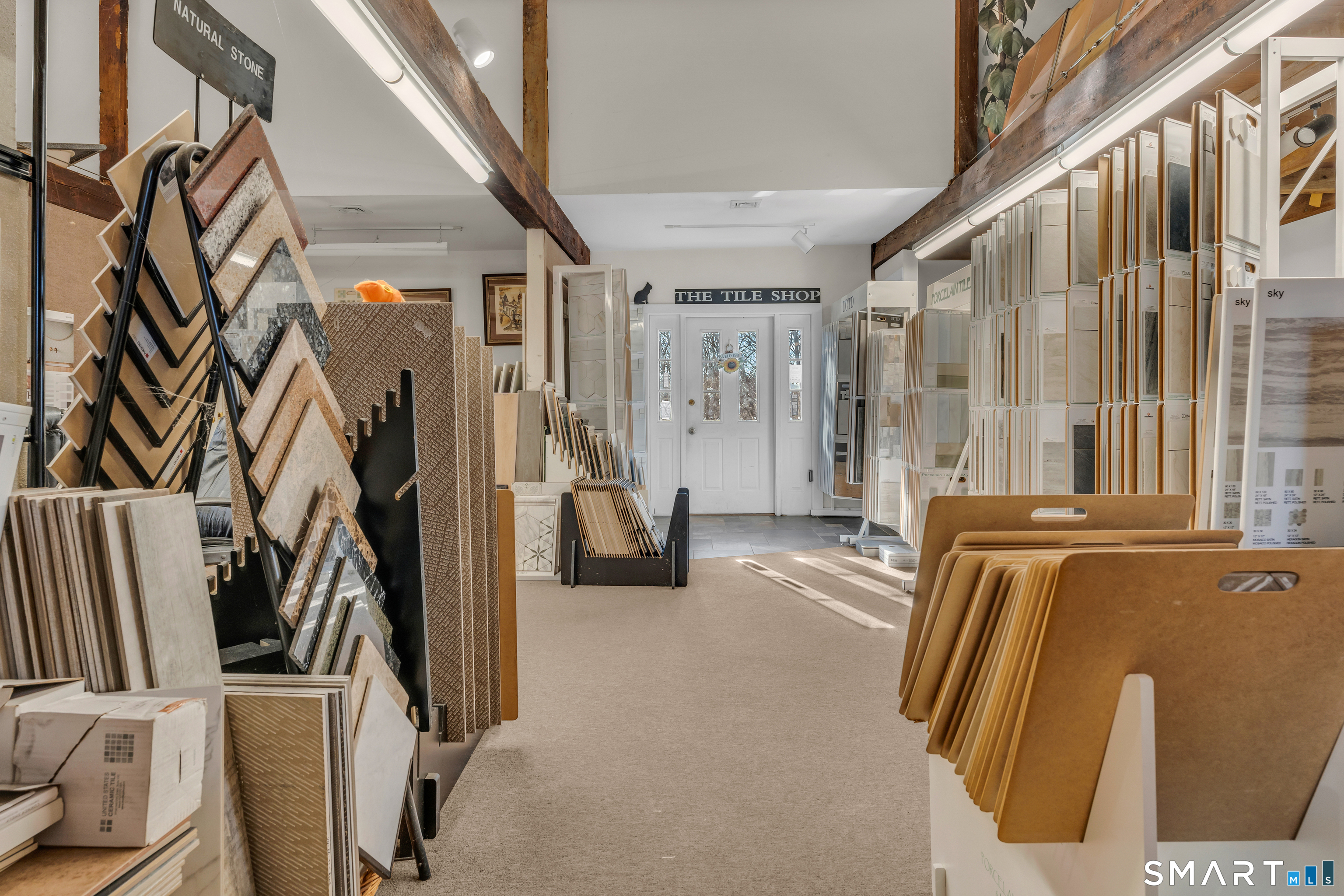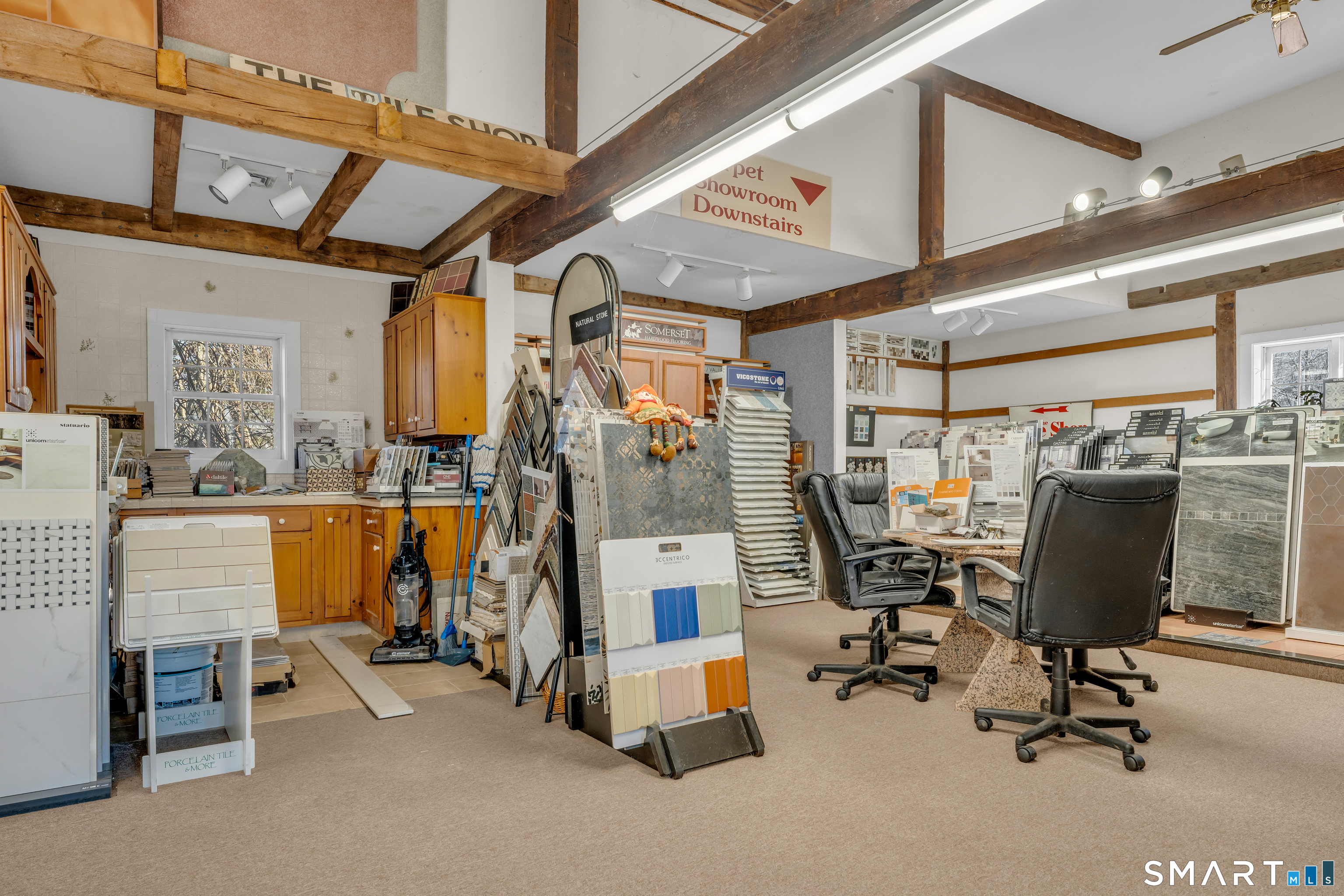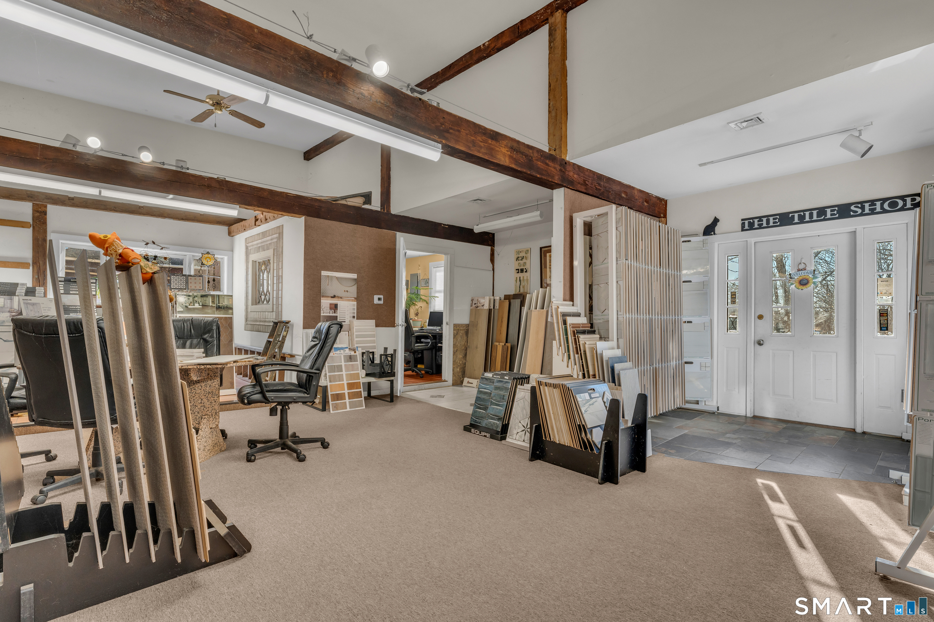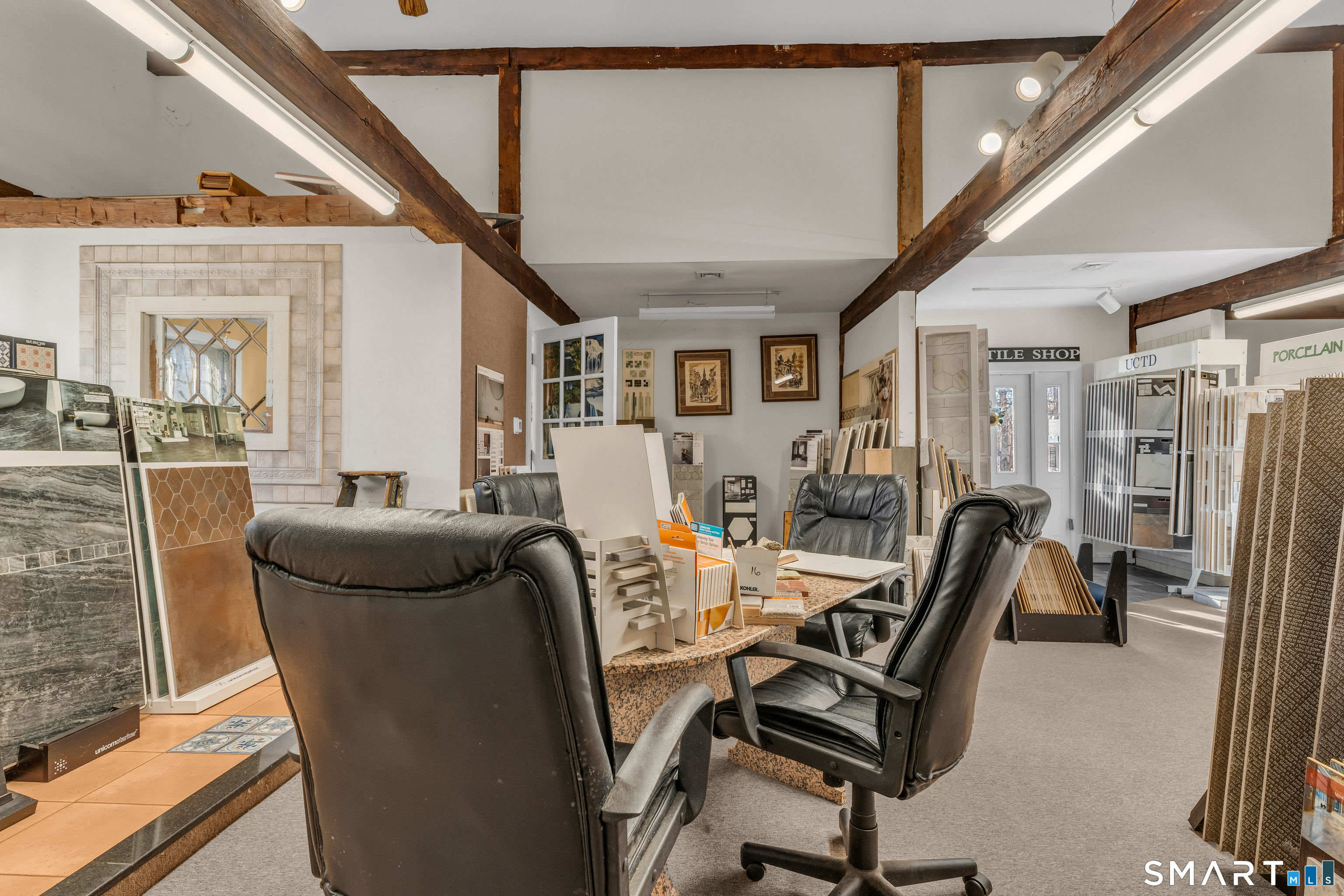 Well-located antique commercial building overlooking the Guilford Mill Pond. The property features an approximately 1,200 SF ground-floor showroom with office space and restroom, currently operating as a tile showroom. Large windows provide excellent visibility and natural light. Suitable for a variety of commercial uses including retail, gallery, or professional office. Prime location with character, flexibility, and strong visibility in the heart of Guilford. Also listed single-family MLS#: 24148563