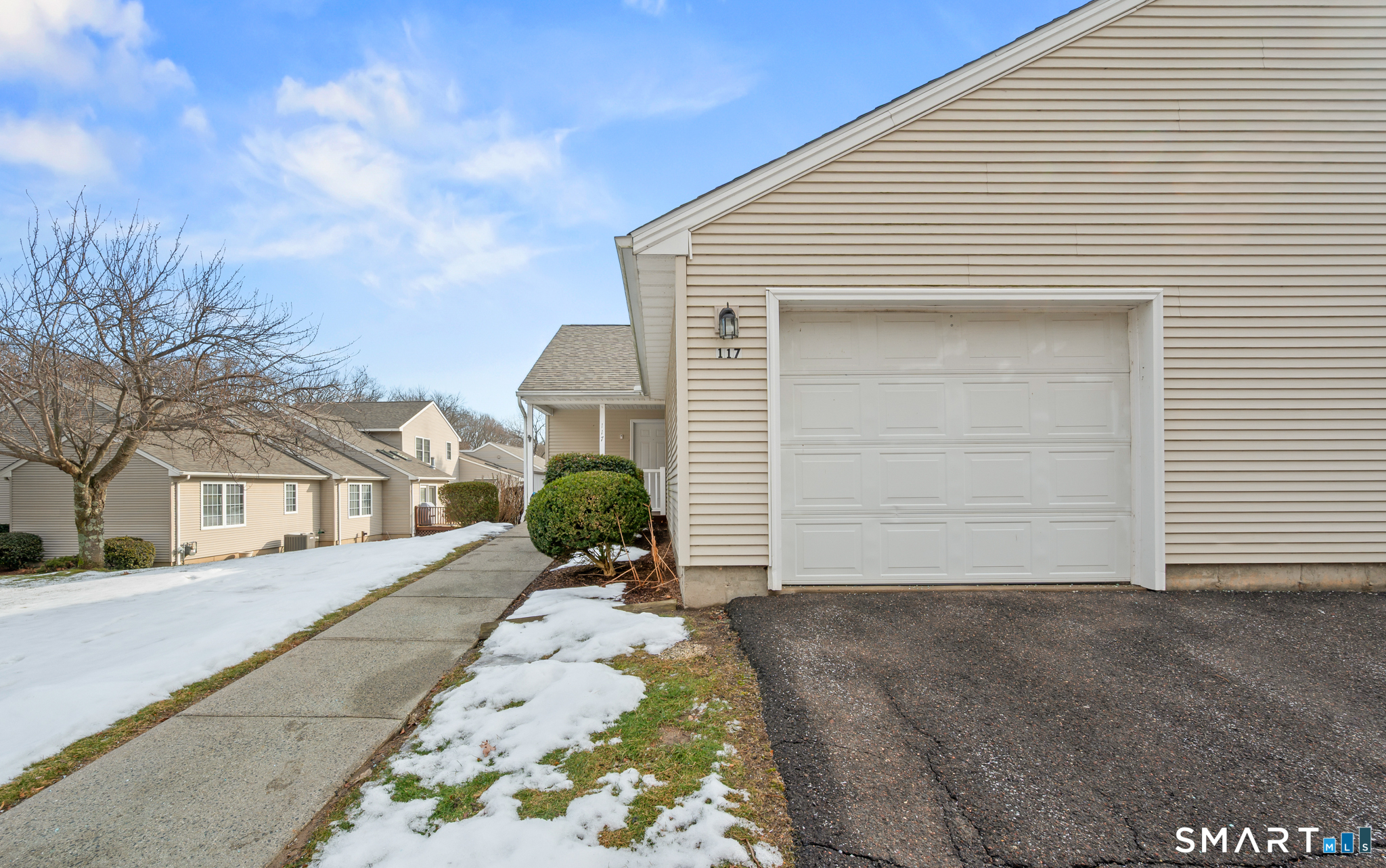 Welcome to effortless one-level living at 117 Dibble Hollow Lane in Windsor Locks. This well-maintained end-unit condominium offers comfort, space, and significant recent improvements. The inviting living room features cathedral ceilings enhanced by brand-new skylights, creating a bright and open atmosphere. Major updates include a new roof along with new natural gas heating and air conditioning systems, providing peace of mind for years to come. The spacious primary bedroom offers excellent storage with a walk-in closet, while the attached one-car garage adds everyday convenience. A full basement, already dry and ready to finish, presents an excellent opportunity to create additional living space, a home office, or recreation area. Located within a well-managed and attractive complex, this home combines low-maintenance living with modern updates in a desirable Windsor Locks location.