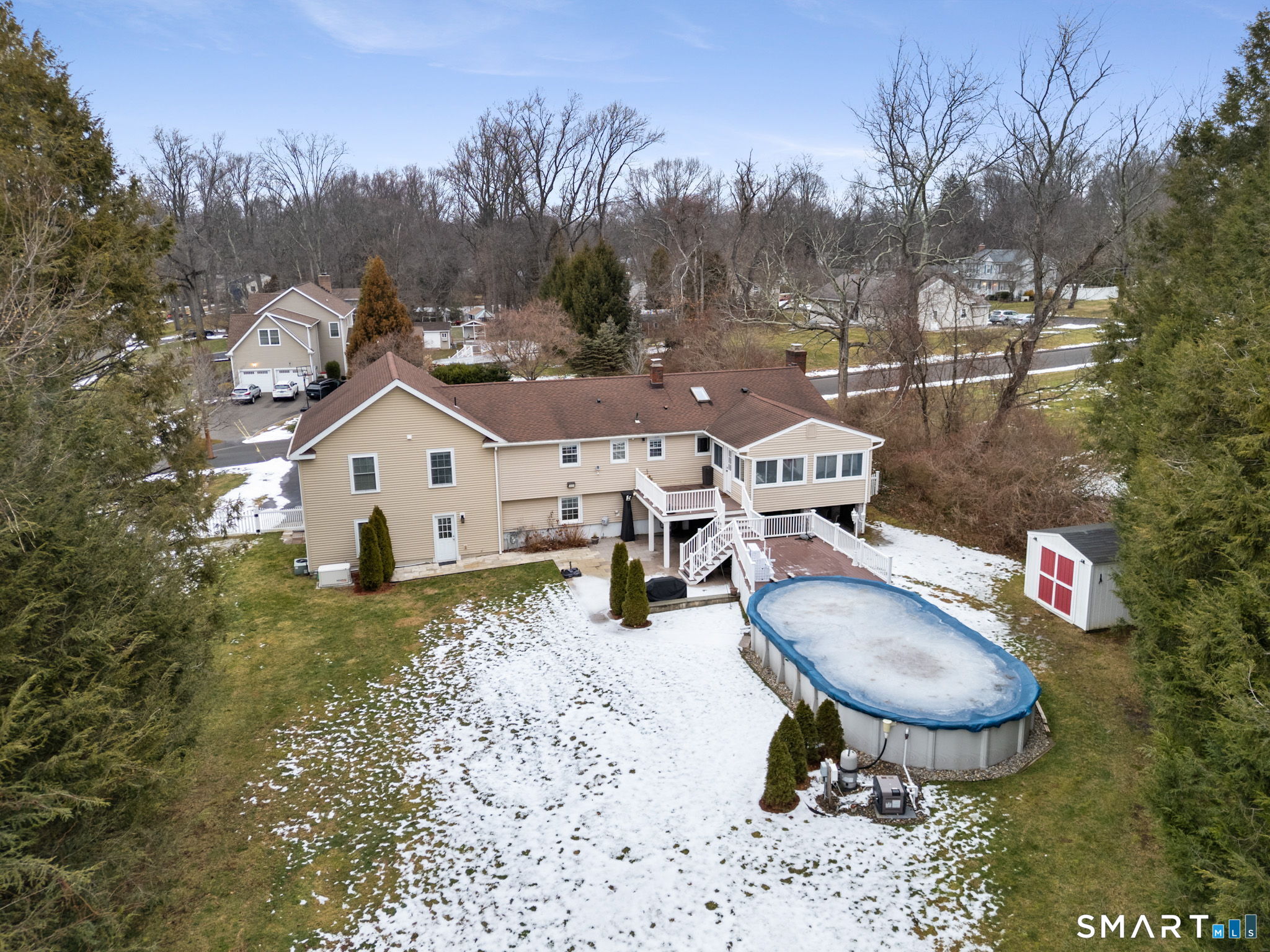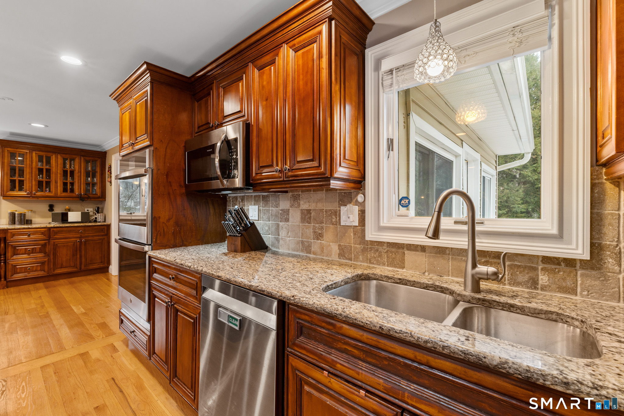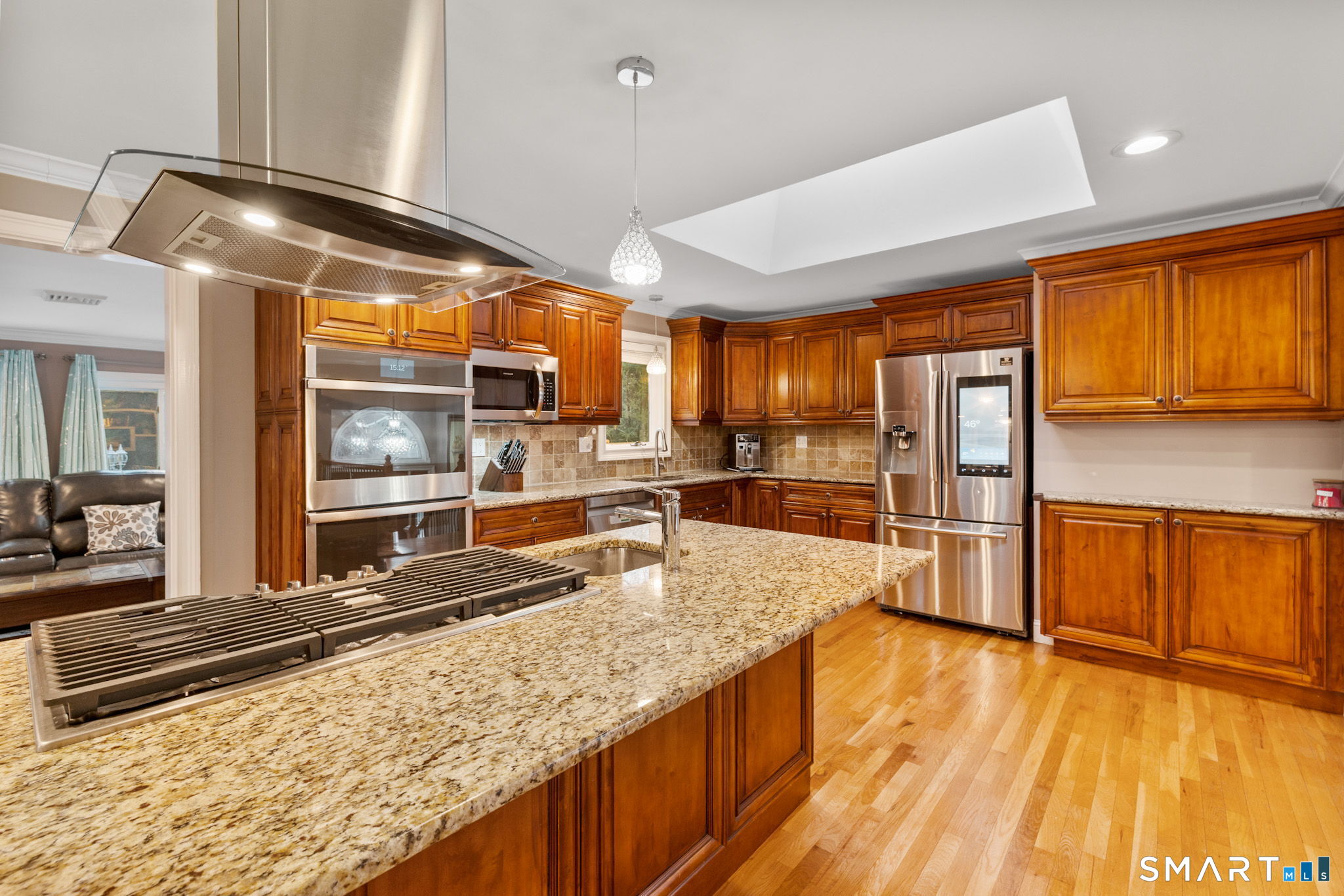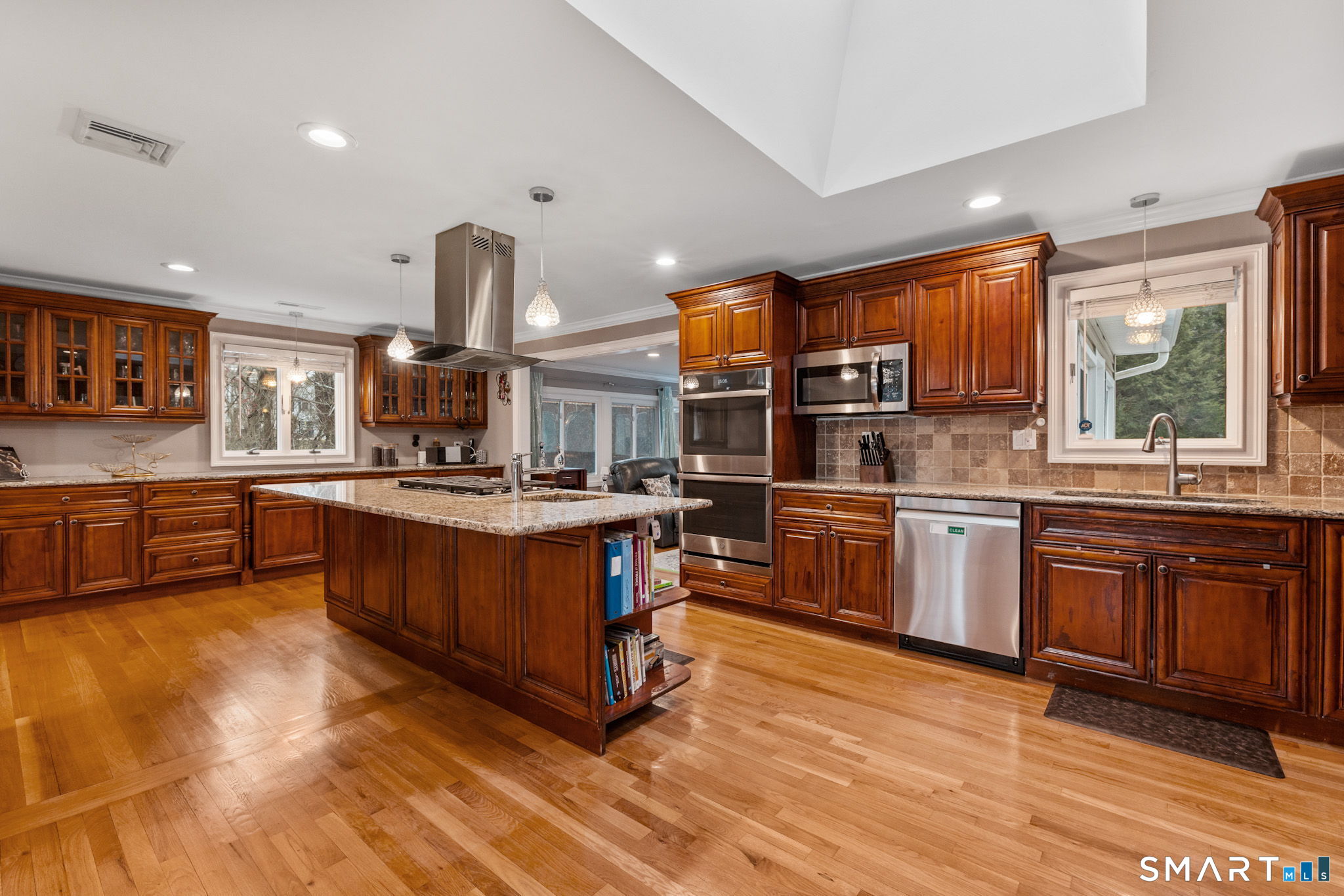 Expansive and beautifully updated, this 5 bedrooms home delivers the space, light, and layout buyers want while set in a desirable neighborhood setting. The main level offers sun-filled living and entertaining spaces with large windows and a natural flow from room to room. The oversized eat-in kitchen is a standout, featuring rich cherry wood cabinetry, granite countertops, stainless steel appliances, two sinks, and a large center island-built for real cooking and effortless hosting. The primary suite is a true retreat, now featuring a recently remodeled spa-style bathroom with a double vanity and a tile-enclosed shower with glass door and elevated finishes. Additional bedrooms are generously sized, offering flexibility for guests, home office, or multi-generational needs. Recessed lighting throughout adds a clean, modern feel across the home. The lower level is made for entertaining and everyday comfort, highlighted by a dramatic floor-to-ceiling natural stone wall and wood-burning fireplace, plus excellent bonus space for a media room, playroom, gym, or extended living area, a bedroom and a full bathroom. Outside, enjoy a private lifestyle-ready setting with a heated saltwater pool, Trex decking, gas grill, and a flat yard perfect for play, pets, or gatherings. A full-house generator adds peace of mind and convenience and 2 car oversized garage for additional storage. A rare combination of scale, upgrades, and indoor/outdoor living, move-in ready and built to impre