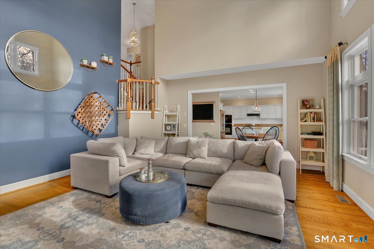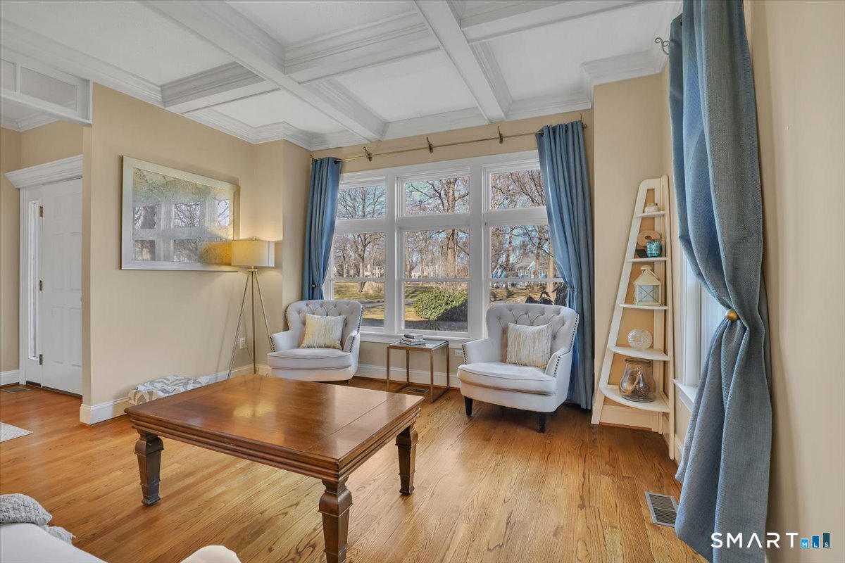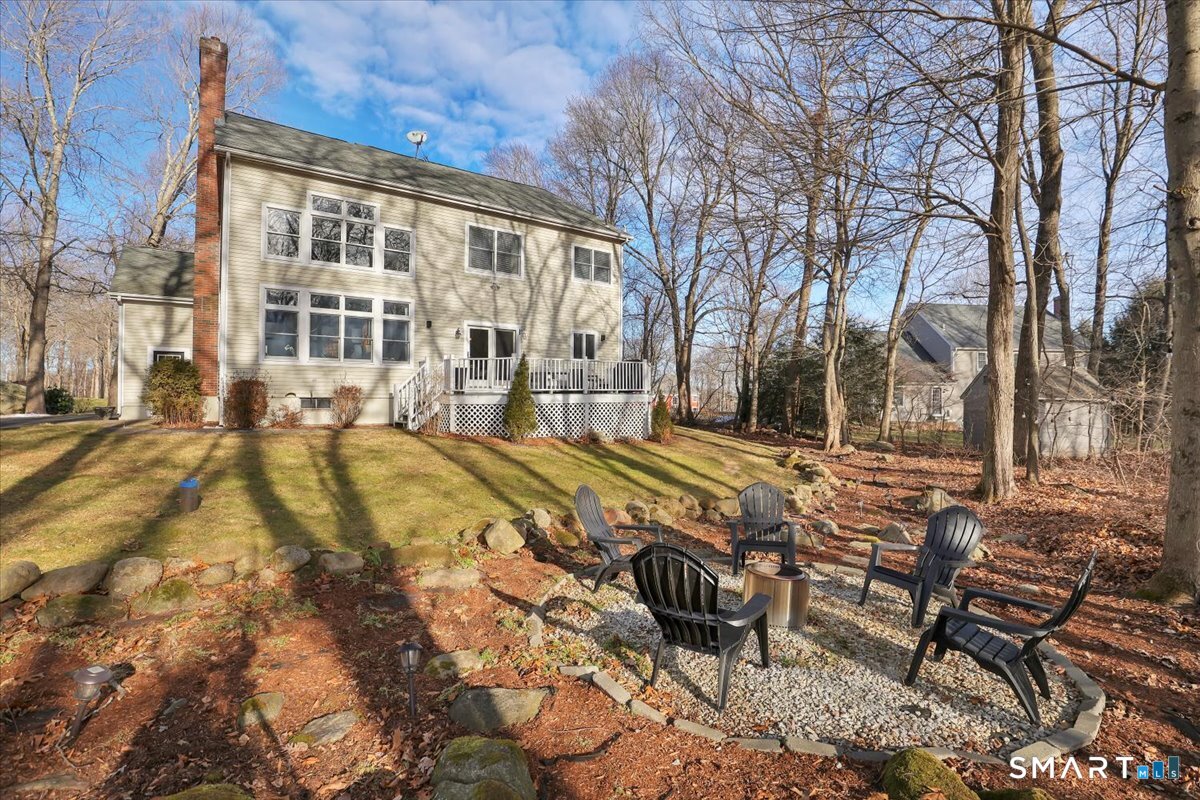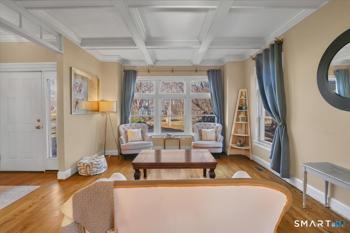 Welcome to a truly happy home that is classic, stylish, and anything but cookie cutter. From the moment you step inside, you are greeted by an impressive open and airy layout enhanced by beautiful mouldings throughout that add character, depth, and architectural interest. The living room features a stunning coffered ceiling that sets the tone for the sophistication found throughout the home. The first floor is exceptional, offering beautiful sight lines as the living room flows seamlessly into the formal dining room, creating a perfect setting for both everyday living and entertaining.The kitchen is well appointed with abundant cabinet space, a center island, and a comfortable eating area with direct access to the deck. Just beyond, the family room is truly impressive, highlighted by soaring two story windows, a fireplace that adds warmth and ambiance, and a vaulted ceiling that elevates the entire space.The upper level offers four bedrooms, including a spacious primary suite with a walk in closet and an updated full bathroom featuring a whirlpool tub. The expansive unfinished basement provides ample storage and endless possibilities for future use. Set on nearly an acre of land, this home enjoys a sunny and private setting. Bright, welcoming, and architecturally sophisticated, this is a very special place to call home!