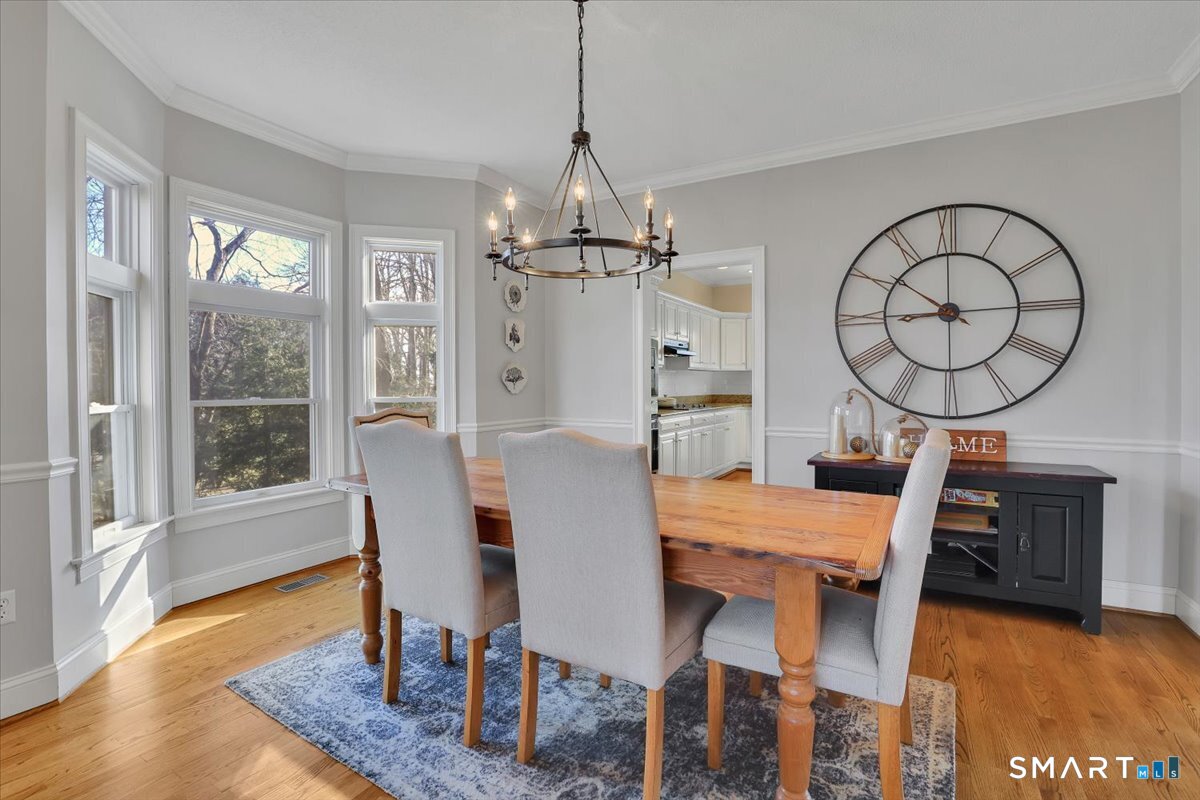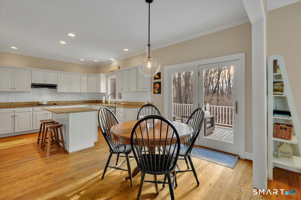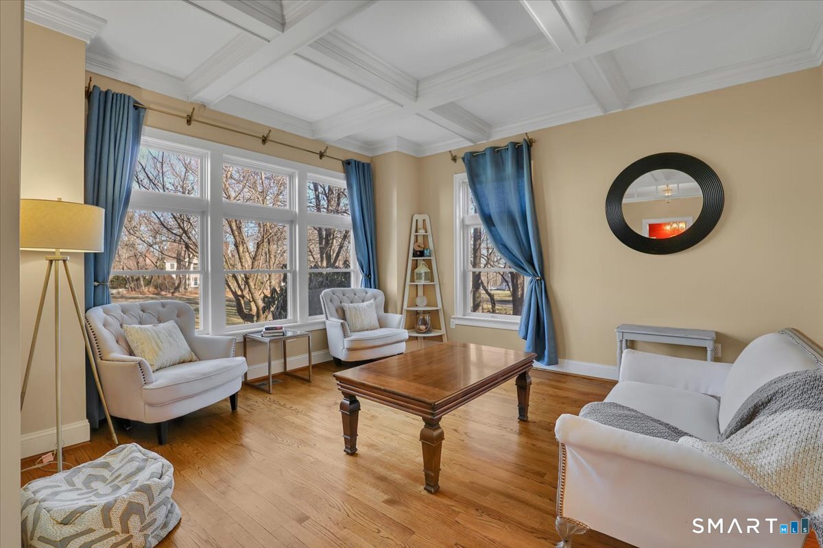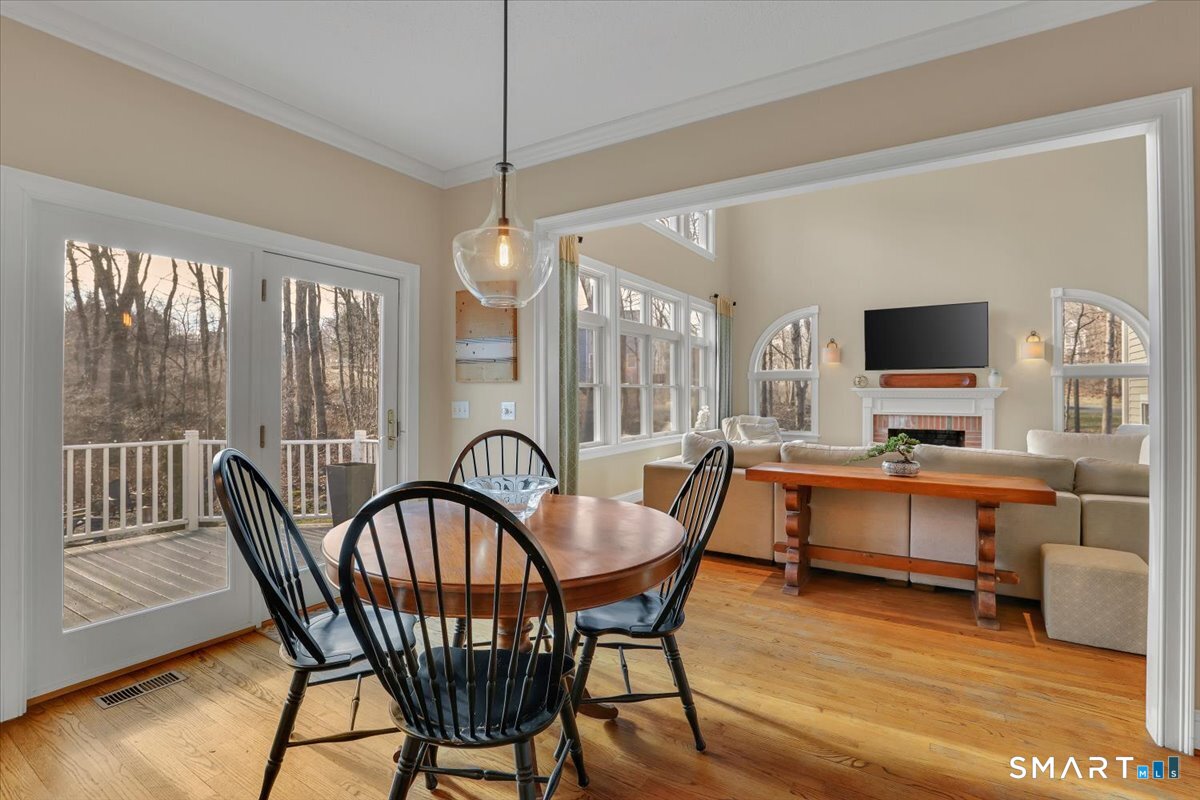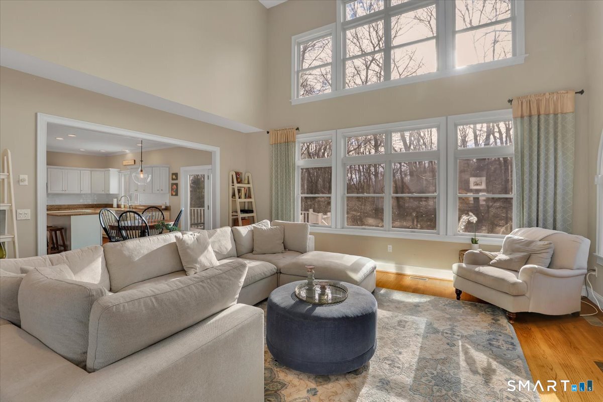 Welcome to a truly happy home that is classic, stylish, and anything but cookie cutter. From the moment you step inside, you are greeted by an impressive open and airy layout enhanced by beautiful mouldings throughout that add character, depth, and architectural interest. The living room features a stunning coffered ceiling that sets the tone for the sophistication found throughout the home. The first floor is exceptional, offering beautiful sight lines as the living room flows seamlessly into the formal dining room, creating a perfect setting for both everyday living and entertaining.The kitchen is well appointed with abundant cabinet space, a center island, and a comfortable eating area with direct access to the deck. Just beyond, the family room is truly impressive, highlighted by soaring two story windows, a fireplace that adds warmth and ambiance, and a vaulted ceiling that elevates the entire space.The upper level offers four bedrooms, including a spacious primary suite with a walk in closet and an updated full bathroom featuring a whirlpool tub. The expansive unfinished basement provides ample storage and endless possibilities for future use. Set on nearly an acre of land, this home enjoys a sunny and private setting. Bright, welcoming, and architecturally sophisticated, this is a very special place to call home!