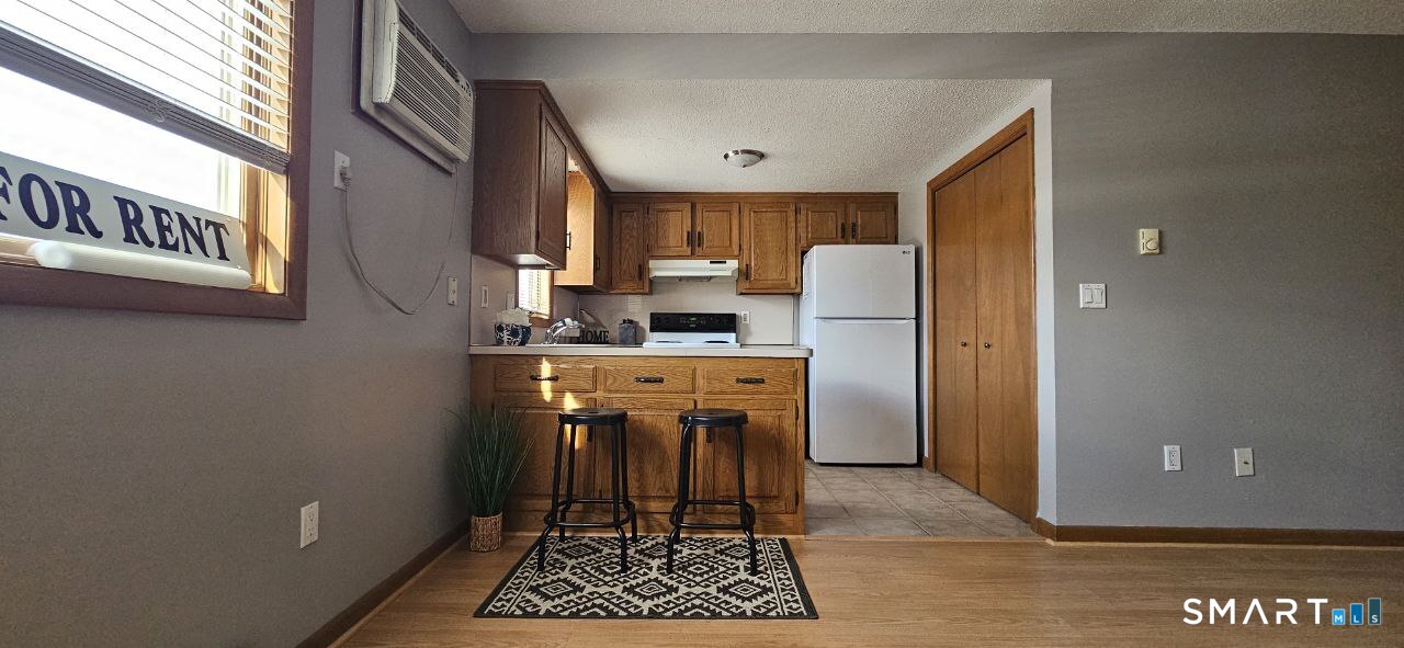 Rarely available, this charming one-bedroom condo unit is ideally situated in the heart of Plainville, just a stone's throw from the Southington town line. As you step through the inviting entrance, you'll be greeted by stylish ceramic tile, setting a warm and welcoming tone for your new home. The open-concept design seamlessly blends the living room, dining area, and kitchen, creating a spacious environment perfect for both relaxation and entertaining. The kitchen boasts a convenient breakfast bar, making it easy to enjoy a quick meal before heading out. For added convenience, a stackable washer and dryer are in a nearby closet, allowing for effortless laundry days. New laminate flooring in a light wood tone enhances the aesthetic, beautifully complementing your furnishings and maximizing the sense of space. The bedroom is a cozy retreat, featuring newly installed carpet and two generous closets that provide ample storage for your belongings. With an unbeatable location, this condo places you within easy reach of a wide array of shops, restaurants, and amenities. Plus, you'll have quick access to the highway in either direction, simplifying your daily commute. Please be aware that this is a non-pet-friendly unit, and the landlord requires a credit score of 600 or higher, with strict no-eviction policies. Strong references are essential, and there will be no exceptions to these requirements. Don't miss your chance to make this delightful condo your own.