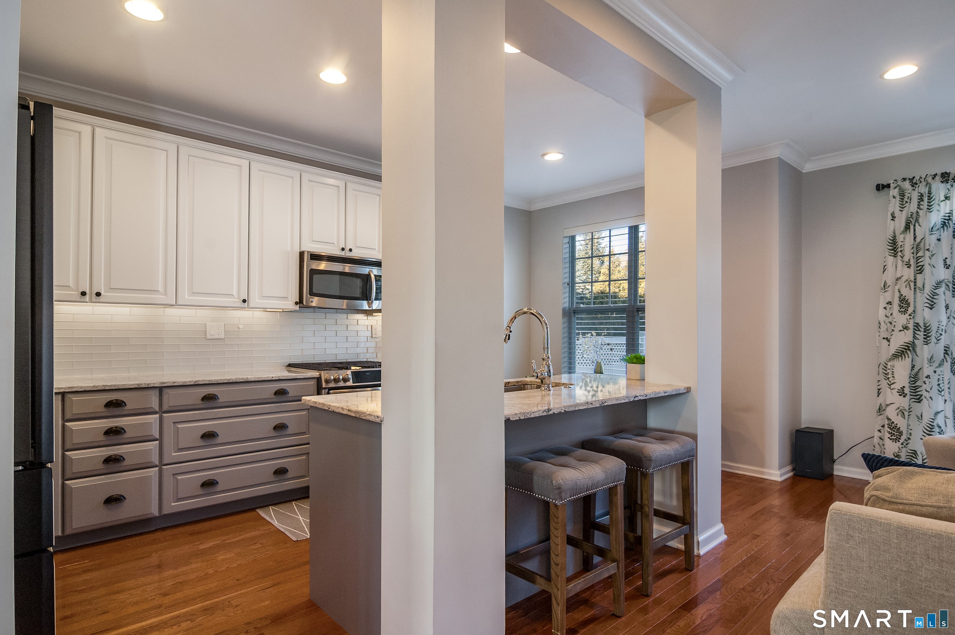 A thoughtful fabulous remodel opened the Kitchen directly to the generous Great Room creating a modern, airy vibe unique to this stunning 3 bedroom Townhome. Ideally set in the highly sought after and beautifully maintained Quaker Green community. Stylish upgrades throughout beginning in the Kitchen w/plentiful cabinetry, striking quartz counters, island w/breakfast bar, newer chic Bespoke Samsung french dr style refrigerator & pretty dining area. Unwind or entertain in the inviting Great Room w/adjoining Dining Room & access to a lovely private patio w/level green space. Gleaming hardwood floor upgrade throughout main & second level. Upstairs the primary suite is relaxing retreat beautifully appointed w/attractive updated bath w/glass tile, lg walk-in closet, & enhanced by cathedral ceiling that lends an open, expansive feel. Two additional well sized bedrooms share the second level w/hall bath & convenient laundry. A generous 3rd level carpeted loft offers options for game/media rm, study, and/or work out space! Future potential in the unfinished LL w/daylight window & already plumbed for bath. Attached garage. Newer furnace(2024) and hot water heater(2023).Smart Nest thermostats. Meticulously maintained and ready for you to move right in and enjoy Quaker Green's fabulous location- easy access to Trout Brook Trail,just a stroll to local shops & restaurants and enjoy the many amenities including heated outdoor pool, fitness center, social & billiard rooms, & kids playground!