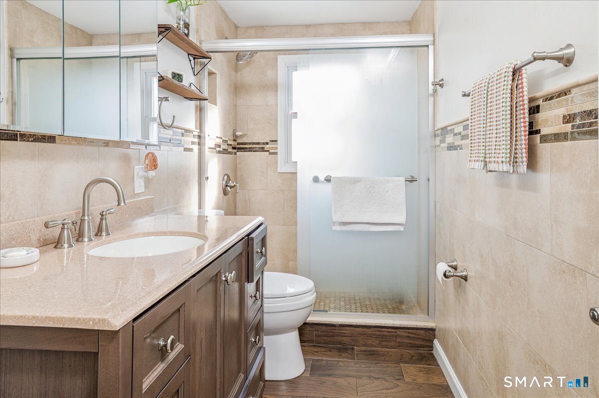Immaculate home that is light and bright with an open floor and nicely updated. Living room with hardwood floors, Eat in kitchen with white cabinets and stainless steel appliances. There is a sunroom/ dining room off the kitchen with the door down to the patio. The 3 bedrooms upstairs all have hardwood floors. There is a nicely updated bath. The walk out lower level has a spacious family room with a wood burning stove & sliders to the large covered patio with a built in grill. The 4th bedroom has barn doors to the family room. An updated bath and laundry room complete this part of the home. There is an in-law that is accessible from the outside or the garage. Lovely flat back yard that is fenced in along with a shed and green house. Newer central air, gas heat and 3 full baths are a few more features of this wonderful home in Springdale on a cul-de-sac street. Walk to the Springdale train station, shops and restaurants. Super convenient location close to the Merrit Parkway and 5 minutes from New Canaan.