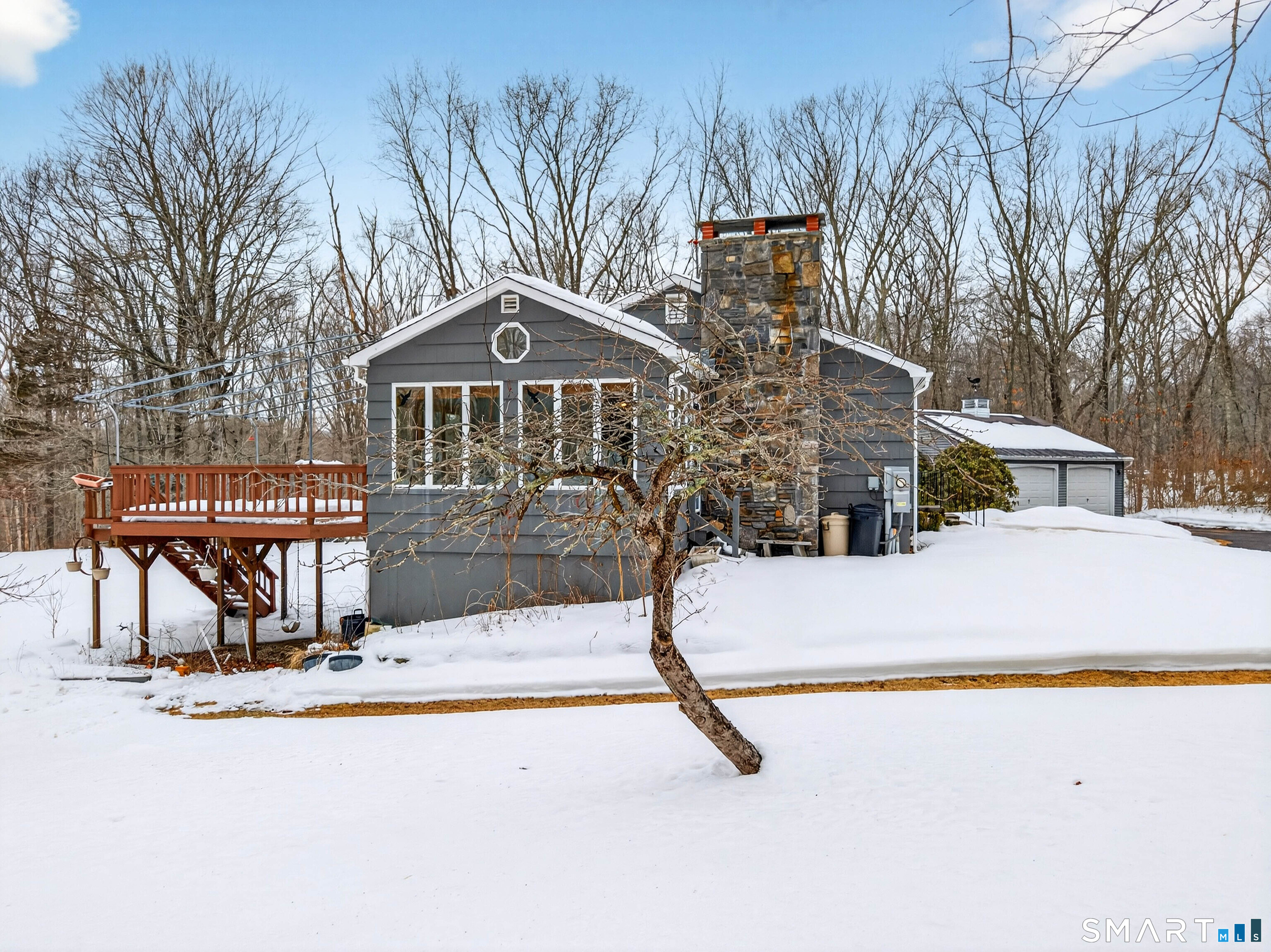Welcome to 85 Bogel Rd, East Haddam. Family owned for over 50 years. This property has been lovingly maintained and blends privacy, space, and convenience on over 2 acres. Less than ten minutes from the Connecticut River, swing bridge, Goodspeed Opera House, and surrounding amenities. The functional layout provides flexibility for entertaining guests on both the main level and the walkout finished lower level. The main level has a full bath and hardwood throughout the bedrooms and living room with stone fireplace. The kitchen and dining room combination lead out to the cathedral ceiling sunroom and upper level deck overlooking the back yard. Kitchen is fully functional with plenty of cabinetry. There are washer hookups on the main level and washer and dryer hookups on the lower level. The lower walkout level has heat and a/c and offers several rooms, including a family room with stone fireplace, rec/laundry room, hobby room, utility room, and full bath. This lower level space offers 1000+sqft and is an excellent opportunity for in-law space or a possible income producing accessory dwelling unit (ADU), check local regulations. A big circular driveway and detached two car garage with electrical power offer plenty of parking and shelter for your vehicles.