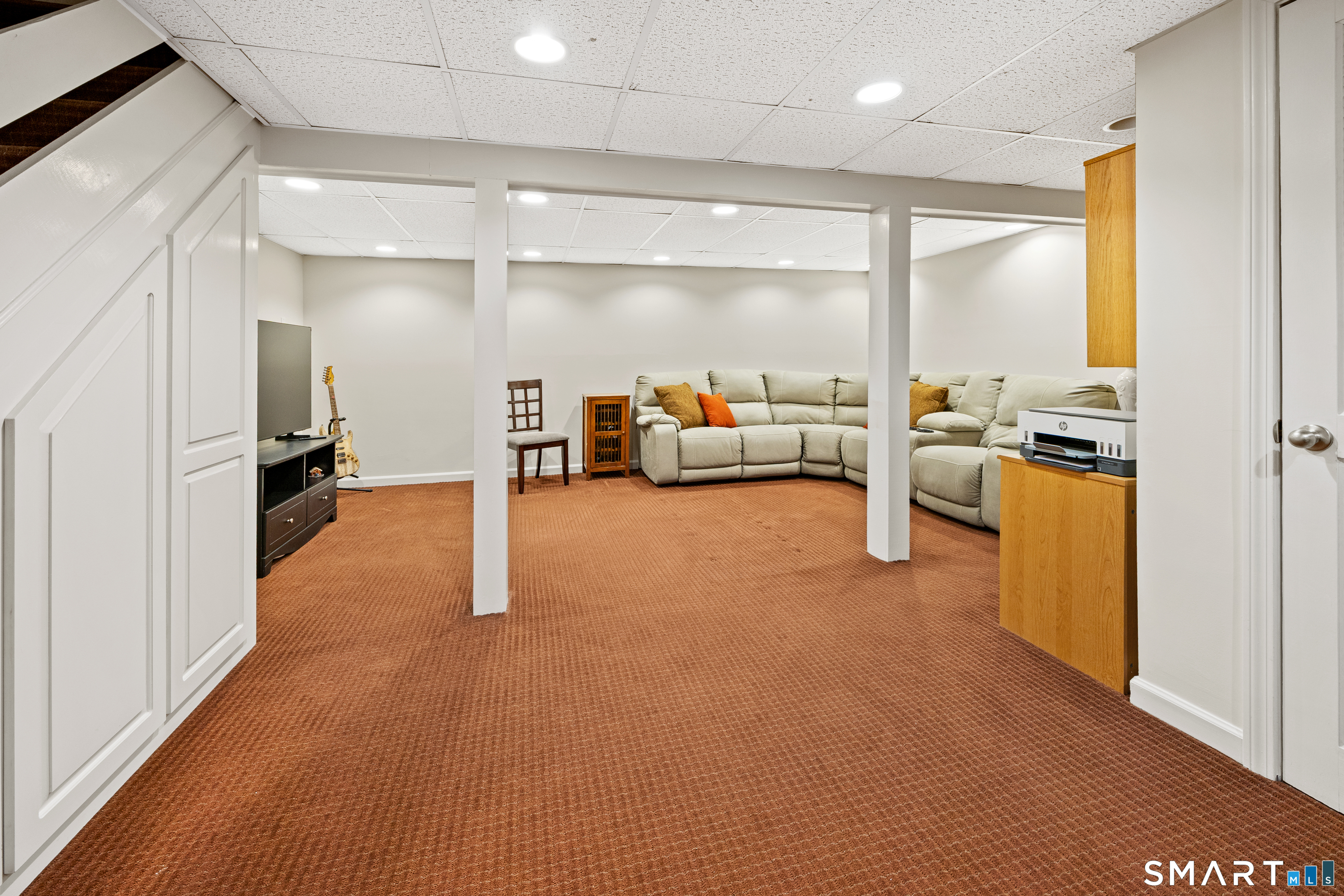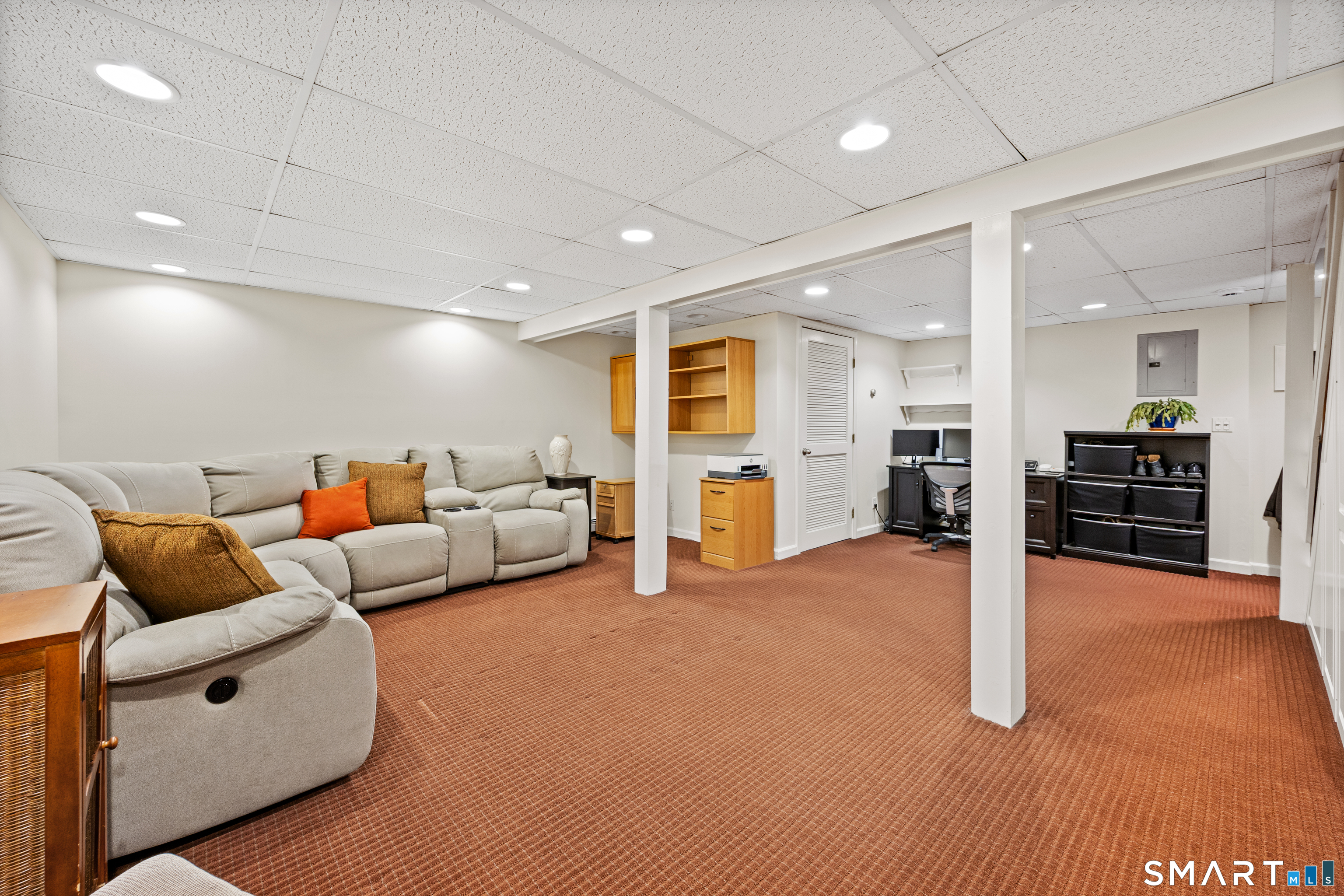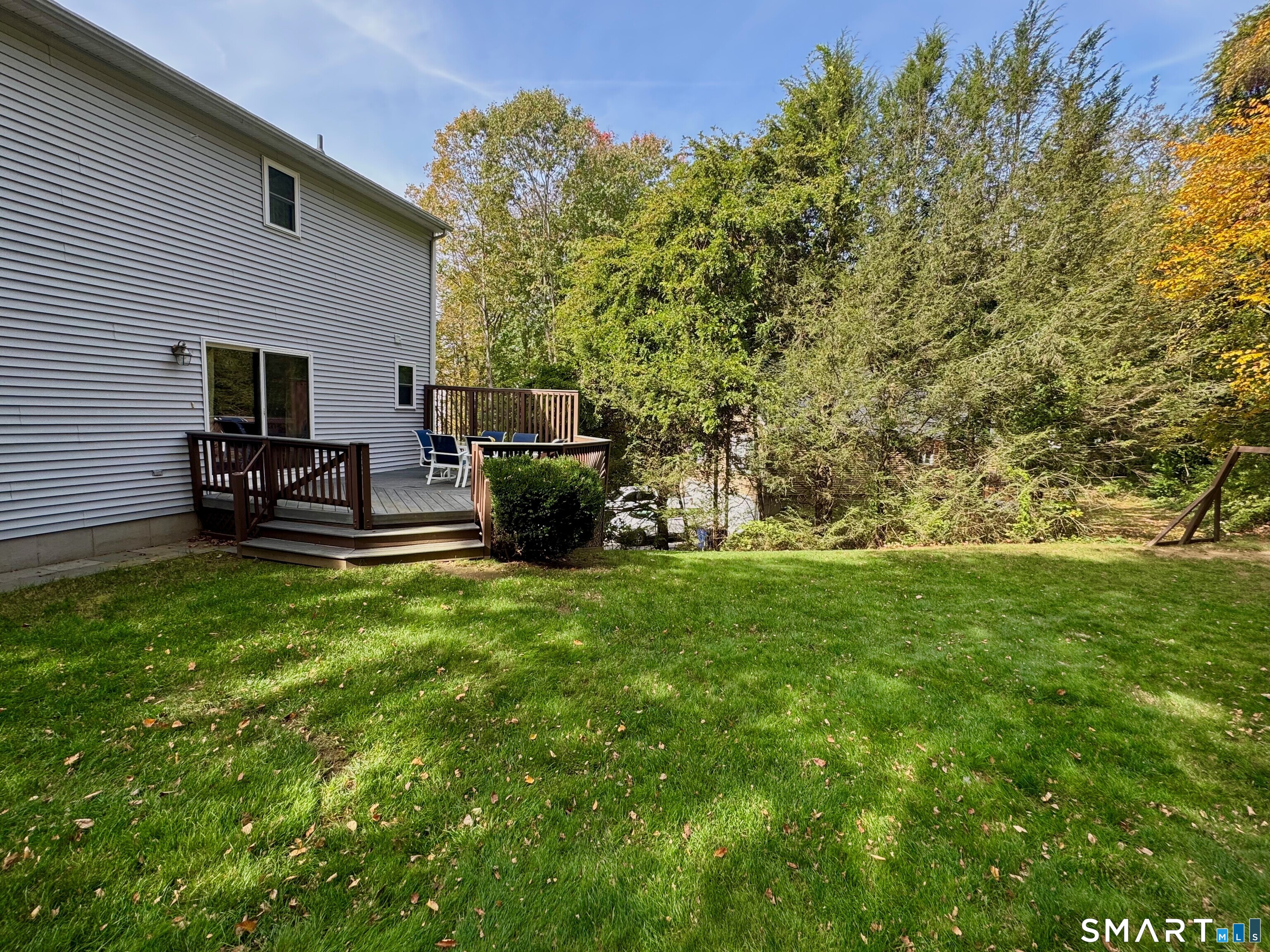 This beautiful Colonial with great curb appeal and striking stonework is perfectly situated in a highly sought-after cul-de-sac neighborhood. The home features a wonderful open floor plan with an elegant living room highlighted by a fireplace and attractive built-ins. The living space flows seamlessly into a beautifully remodeled kitchen with a breakfast bar and a spacious dining area with sliding doors to a large, comfortable deck-perfect for relaxing outdoors. Just off the main living area is a versatile den with a large closet, ideal as a home office or potential fourth bedroom, along with a full bath and convenient first-floor laundry. Upstairs you will find a spacious primary bedroom with a large walk-in closet, two additional generously sized bedrooms, and a full bath. A finished lower level with good storage adds valuable additional living space. List of improvements include: freshly painted interior (2026), roof (2020), driveway (2022), oil tank (2024), front porch (2022), remodeled kitchen, replacement windows, whole-house generator, and invisible dog fence. This well-maintained home offers a convenient location close to highways, shopping, schools, and parks.