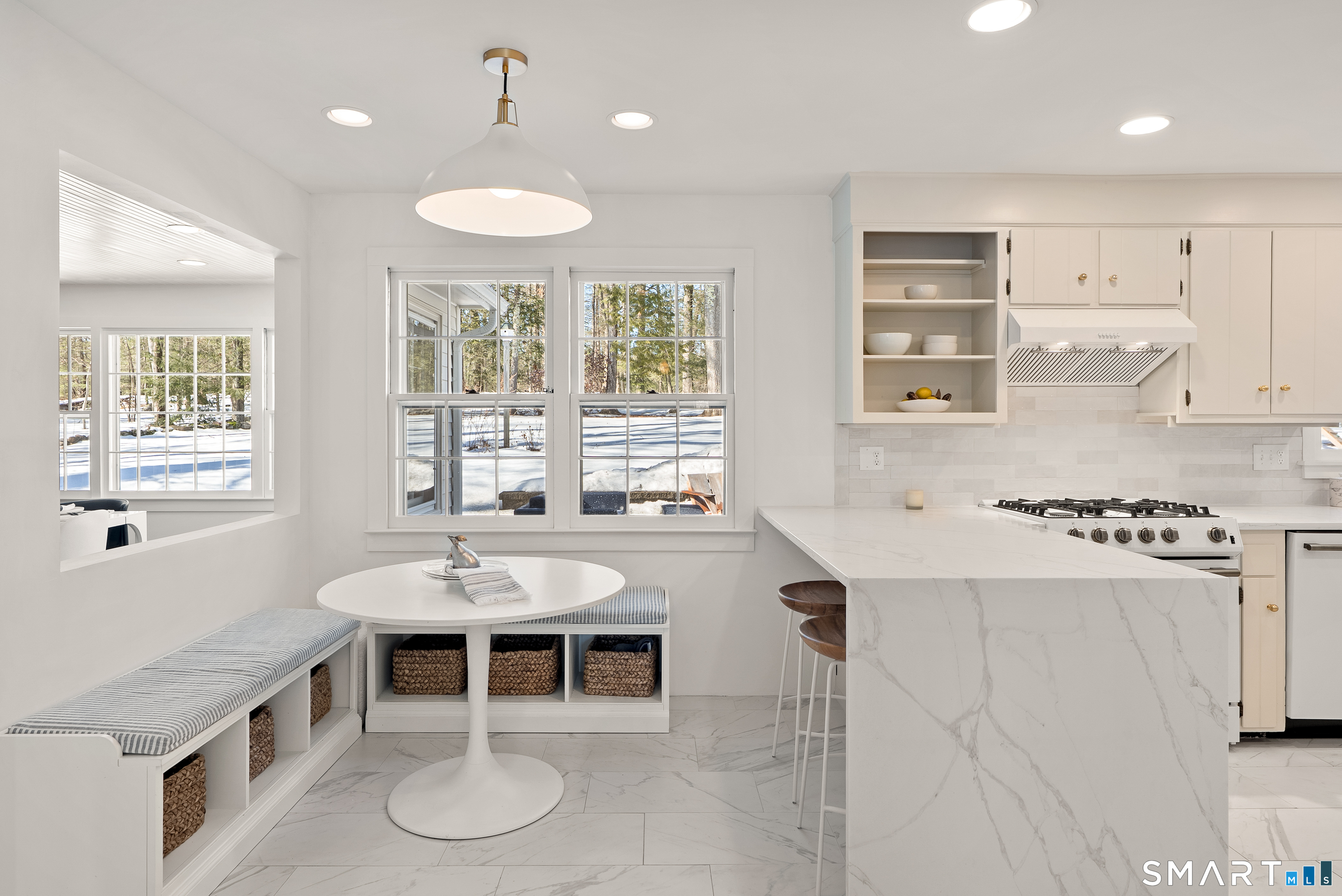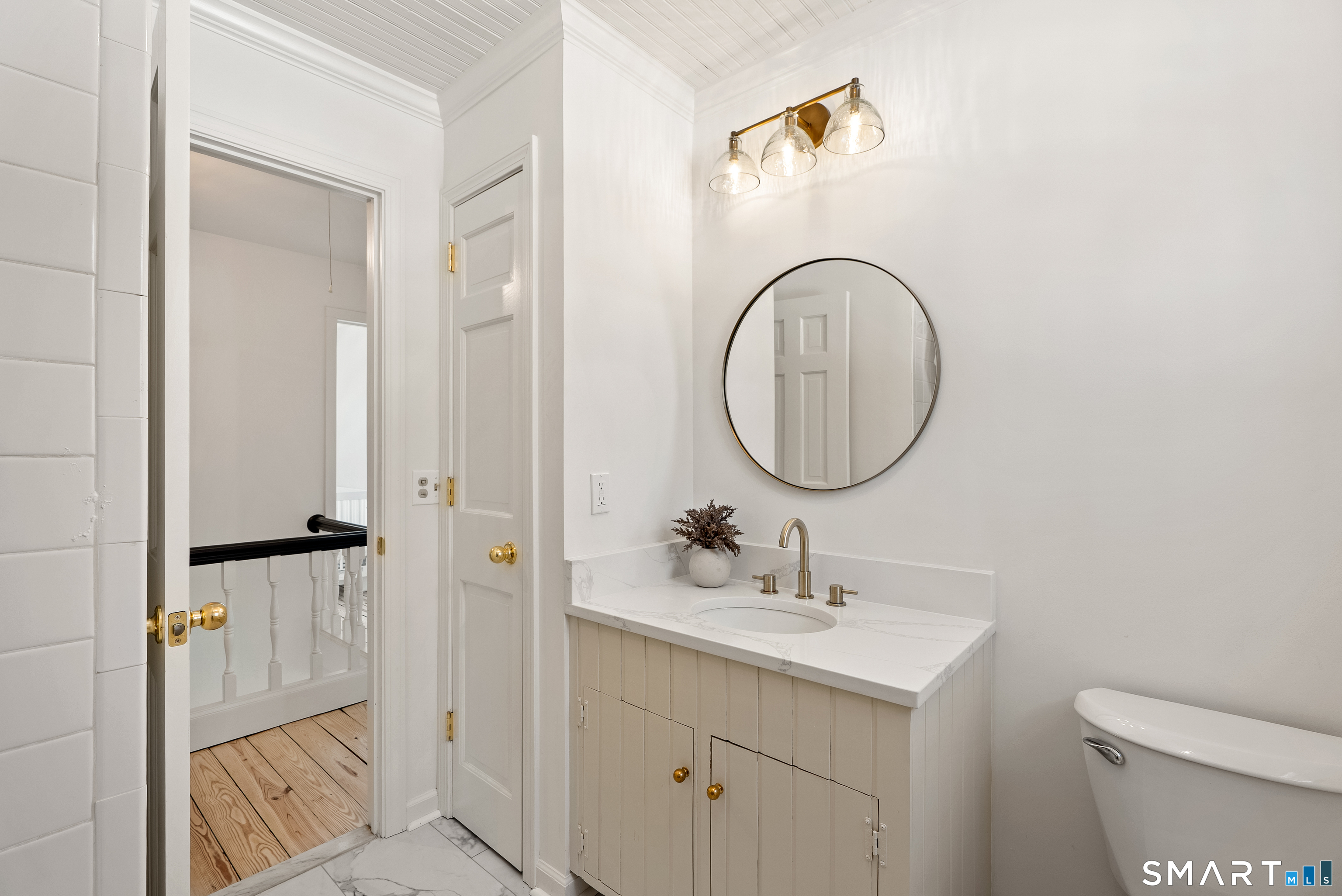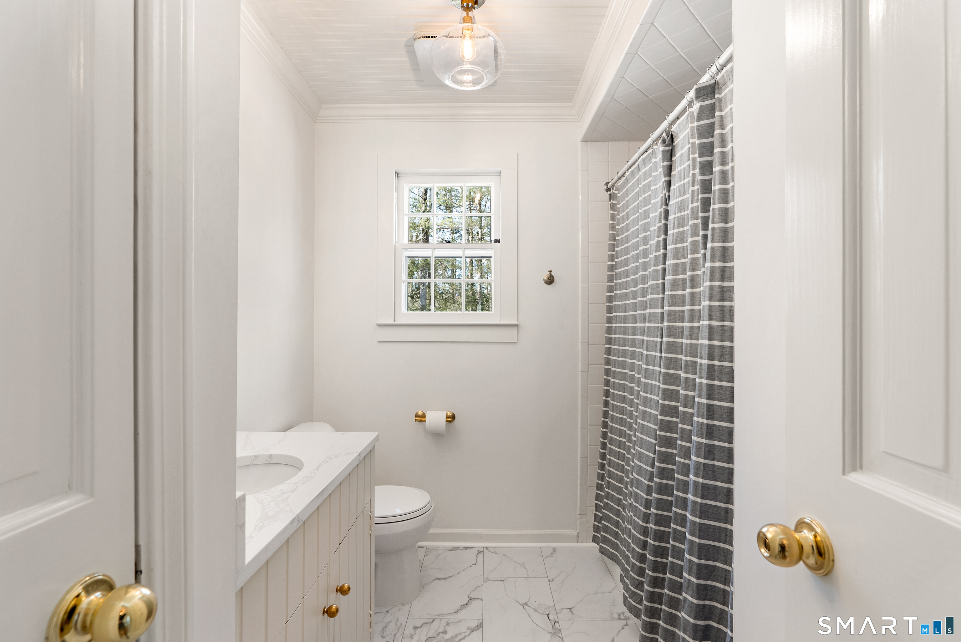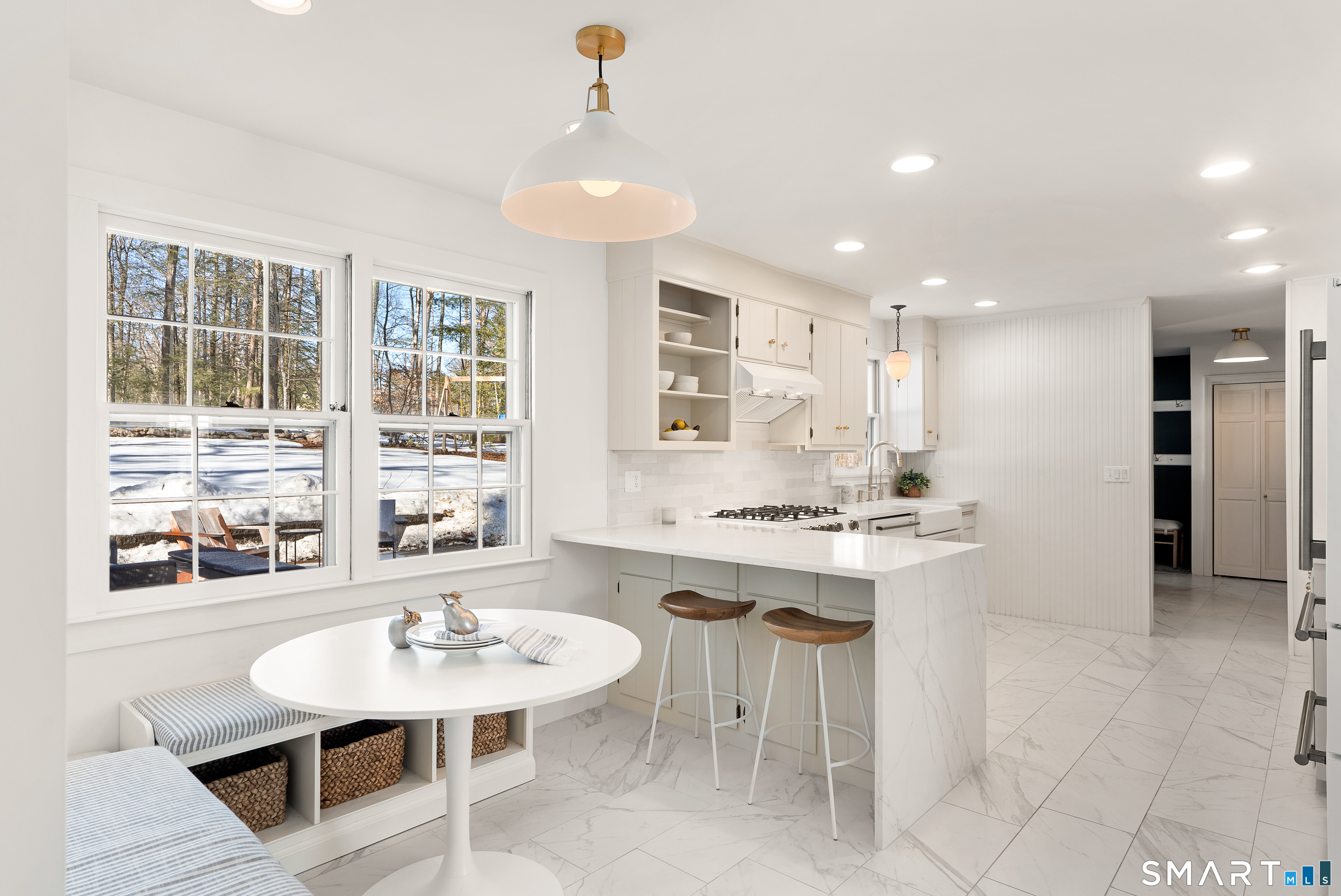 Perched above the surrounding homes, 7 Shaw Drive offers exceptional natural light, added privacy, and a warm, move-in-ready living experience in the heart of Simsbury. Thoughtfully renovated by owners who originally planned to stay long term, the home blends classic New England charm with refined modern design. Inside, you'll find custom-refinished hardwood floors, freshly painted interiors, custom shiplap wall paneling in several rooms, and designer light fixtures installed throughout much of the home, creating a cohesive and elevated feel. The updated bathrooms feature quartz countertops and designer fixtures, while the fully renovated kitchen showcases quartz countertops, a farmhouse sink, custom tile backsplash, high-end appliances, and premium unlacquered brass fixtures and hardware. Major improvements have already been completed, including a brand-new roof, full exterior repainting, and a newly constructed driveway with expanded parking at the top of the property, offering convenient space for multiple vehicles and guests. The home also includes a professional-grade whole-house water softener and filtration system, improving water quality while protecting plumbing fixtures and appliances. A fireplace-anchored dining space and welcoming layout make the home ideal for both everyday living and entertaining. Outside, the elevated setting creates a peaceful backdrop for relaxing or gathering with friends.