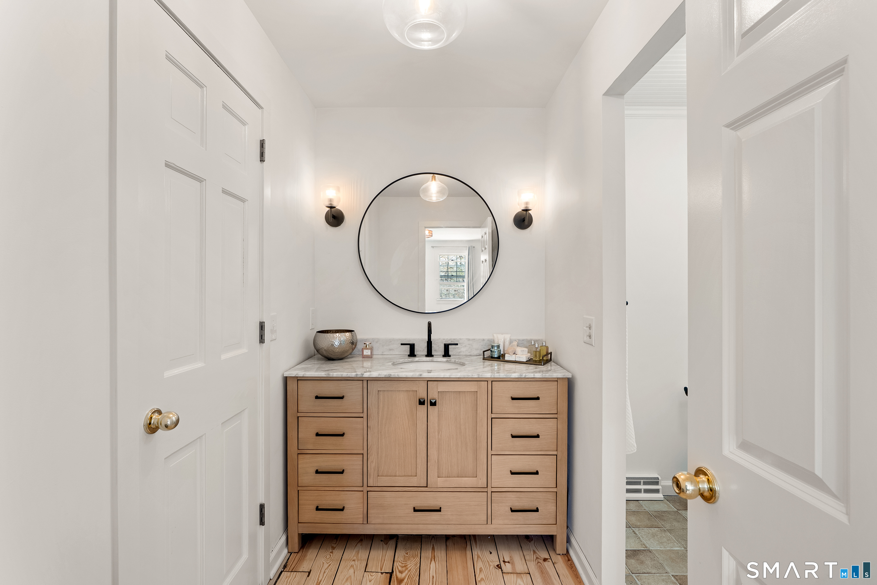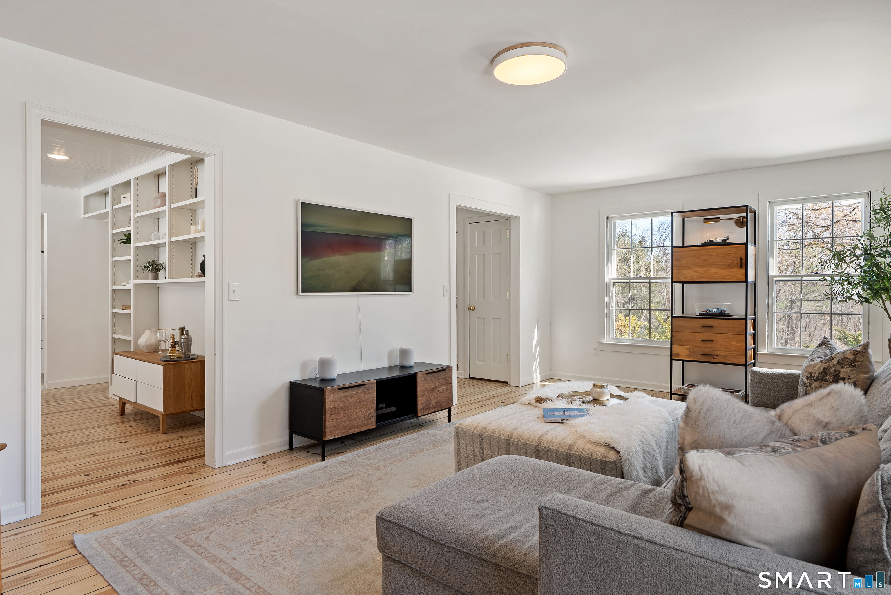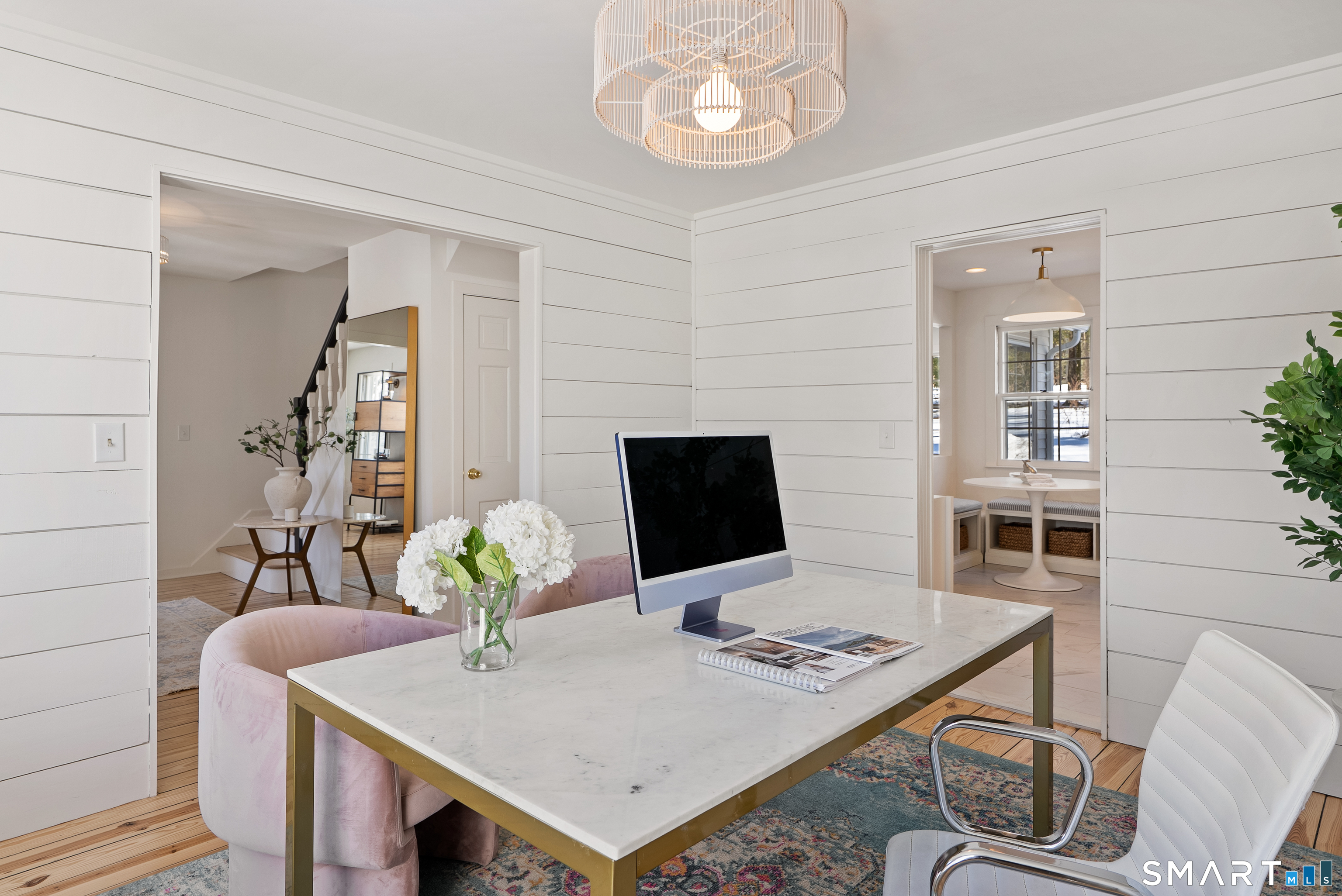 Perched above the surrounding homes, 7 Shaw Drive offers exceptional natural light, added privacy, and a warm, move-in-ready living experience in the heart of Simsbury. Thoughtfully renovated by owners who originally planned to stay long term, the home blends classic New England charm with refined modern design. Inside, you'll find custom-refinished hardwood floors, freshly painted interiors, custom shiplap wall paneling in several rooms, and designer light fixtures installed throughout much of the home, creating a cohesive and elevated feel. The updated bathrooms feature quartz countertops and designer fixtures, while the fully renovated kitchen showcases quartz countertops, a farmhouse sink, custom tile backsplash, high-end appliances, and premium unlacquered brass fixtures and hardware. Major improvements have already been completed, including a brand-new roof, full exterior repainting, and a newly constructed driveway with expanded parking at the top of the property, offering convenient space for multiple vehicles and guests. The home also includes a professional-grade whole-house water softener and filtration system, improving water quality while protecting plumbing fixtures and appliances. A fireplace-anchored dining space and welcoming layout make the home ideal for both everyday living and entertaining. Outside, the elevated setting creates a peaceful backdrop for relaxing or gathering with friends.