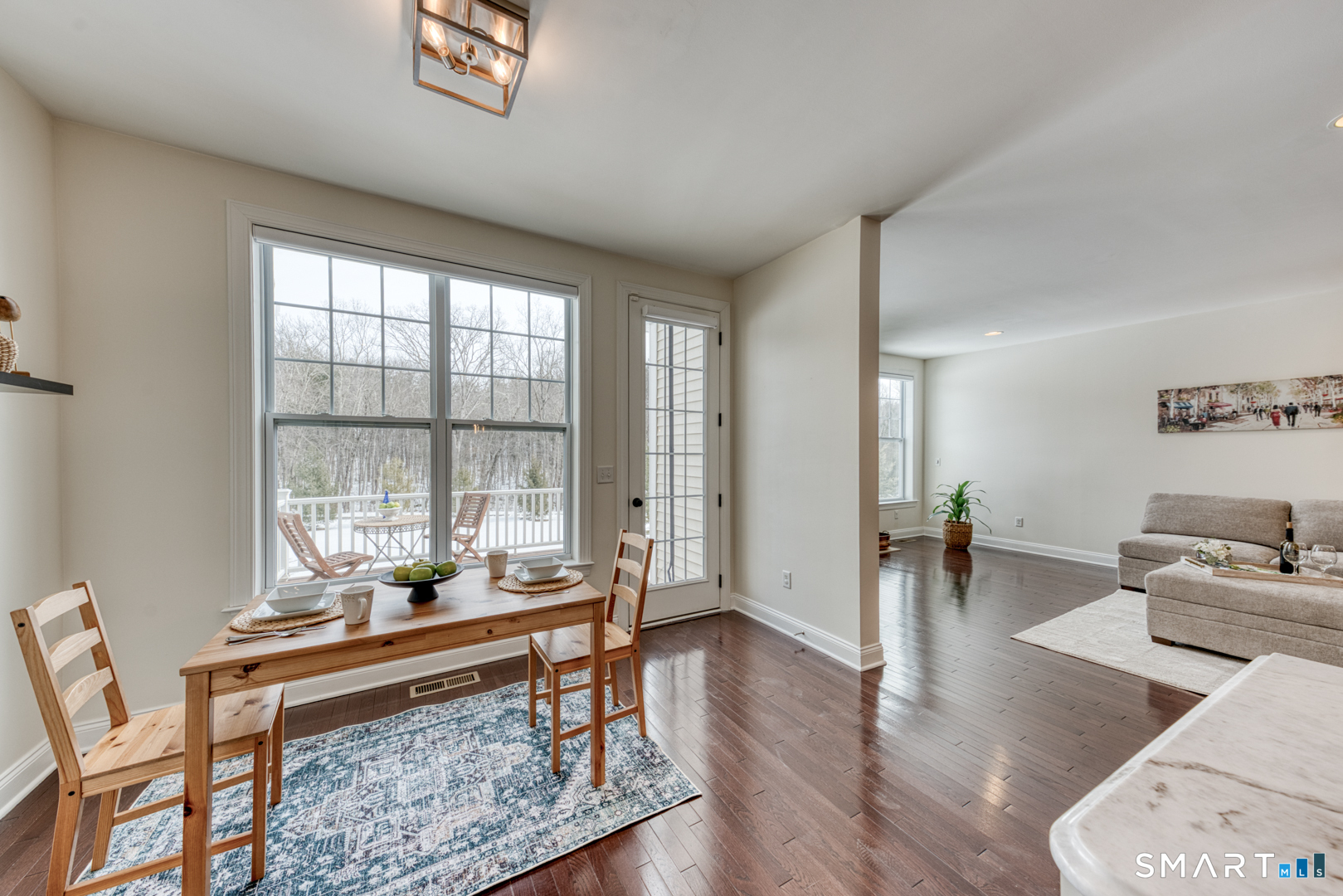 Set at the end of a quiet cul-de-sac in ONE OF RIDGEWOODS COVETED LOCATIONS, this home overlooks an expansive manicured lawn bordered by evergreens and woodland for exceptional privacy and year round natural beauty. Sunlight fills every room, enhancing the warm, cohesive feel of HARDWOOD FLOORS THROUGHOUT BOTH LEVELS - a rare feature in this community. The bright, sparkling kitchen features white cabinetry, undermount lighting, stainless appliances, & spacious center island/breakfast bar perfect for "cooking with company". Genuine MARBLE IN THE KITCHEN AND BATHS adds the patina of refined, timeless elegance. A charming breakfast nook overlooks the sundeck, inviting you to dine al fresco basking in sunshine & nature. An open dining area flows easily into the large living room with gas fireplace which provides warmth & ambiance as do the $5,600 Modern Smart Shades. A flexible office/playroom/den completes the main floor. Upstairs, a loft offers flex space leading to the primary suite with walk-in closet, double vanity, tile shower & jacuzzi tub. Two additional bedrooms, a full bath, and laundry complete this level. The walkout lower level has great sunlight with glass doors opening to the patio and is plumbed for potential in-law, workshop or family room. Ridgewood amenities include an 8,300 sq ft clubhouse, fitness center, yoga space, movie theatre, indoor basketball, tennis, & heated pool - A resort oasis! Don't miss this rare opportunity to own this truly special home.