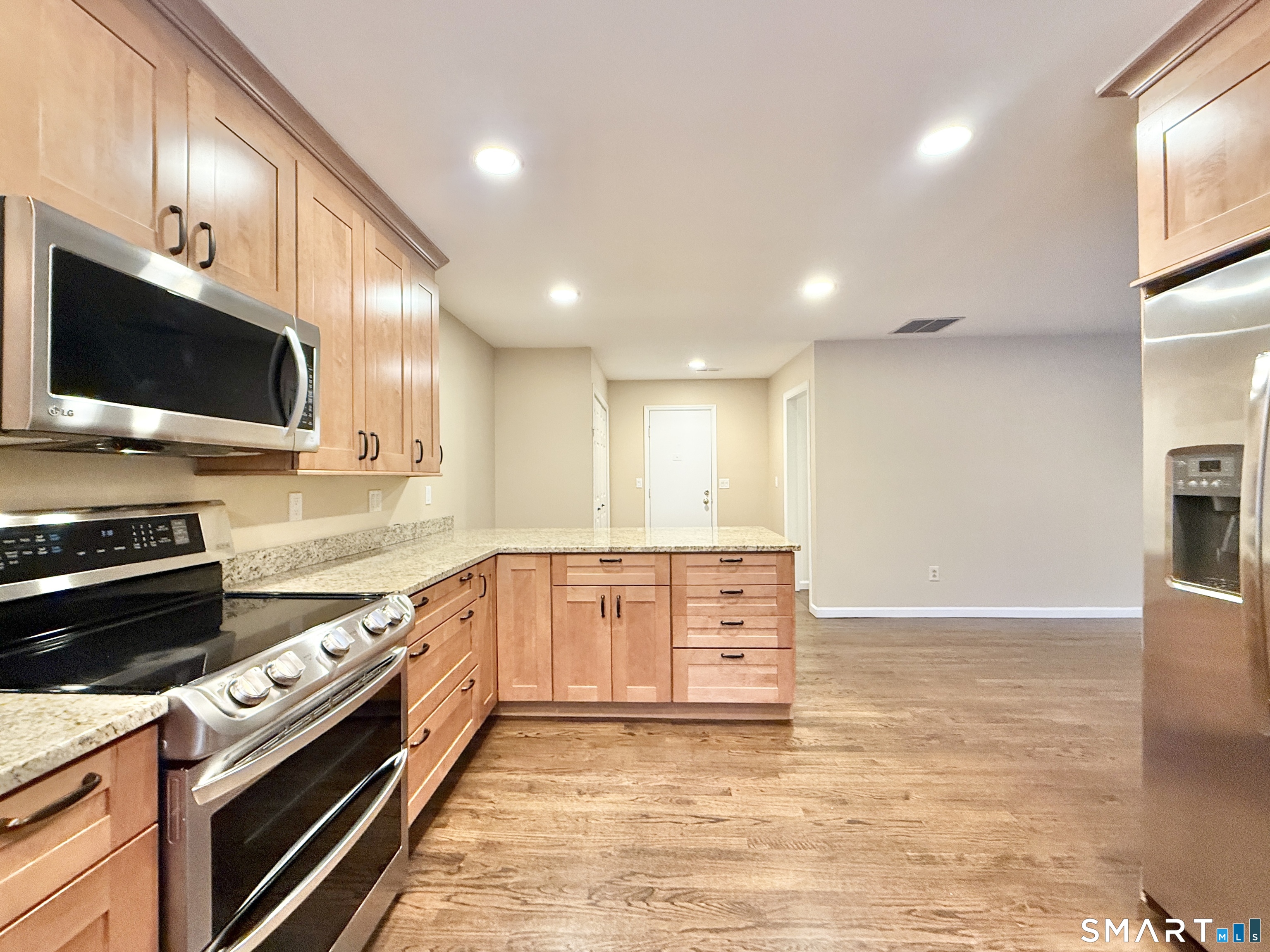The ever-popular Leefair condo complex is the setting of this delightful and renovated end unit. A large Living Room with stone fireplace is open to the Dining Area and flows into the eat-in Kitchen with granite countertops and peninsula, as well as stainless appliances....a chef's dream. There is also a Study with a bay window. A Laundry area is on the main level, which is perfect since your linens and towels are on this floor. Another plus is the hard-to-find main level Primary Suite with ceiling fan, a walk-in closet and a massive redone bathroom. Hardwood floors throughout the first floor. Additional square footage in the walk-out Lower Level includes a spacious Family Room with a ceiling fan and a bank of sliders to the private and oversized patio area. A second Bedroom has close access to the renovated hall bath. There is also a den on this floor. Tons of storage and a hook-up for an additional Laundry, if needed is all on this level. The two-car garage is pristine and provides entry right into the main floor. Ask me about the secret closet downstairs. Move-in ready unit just waiting for its next lucky owners.