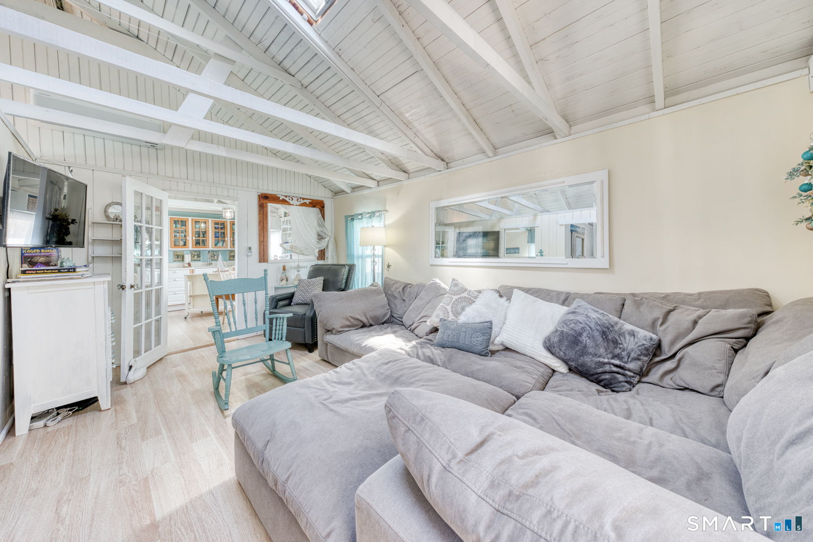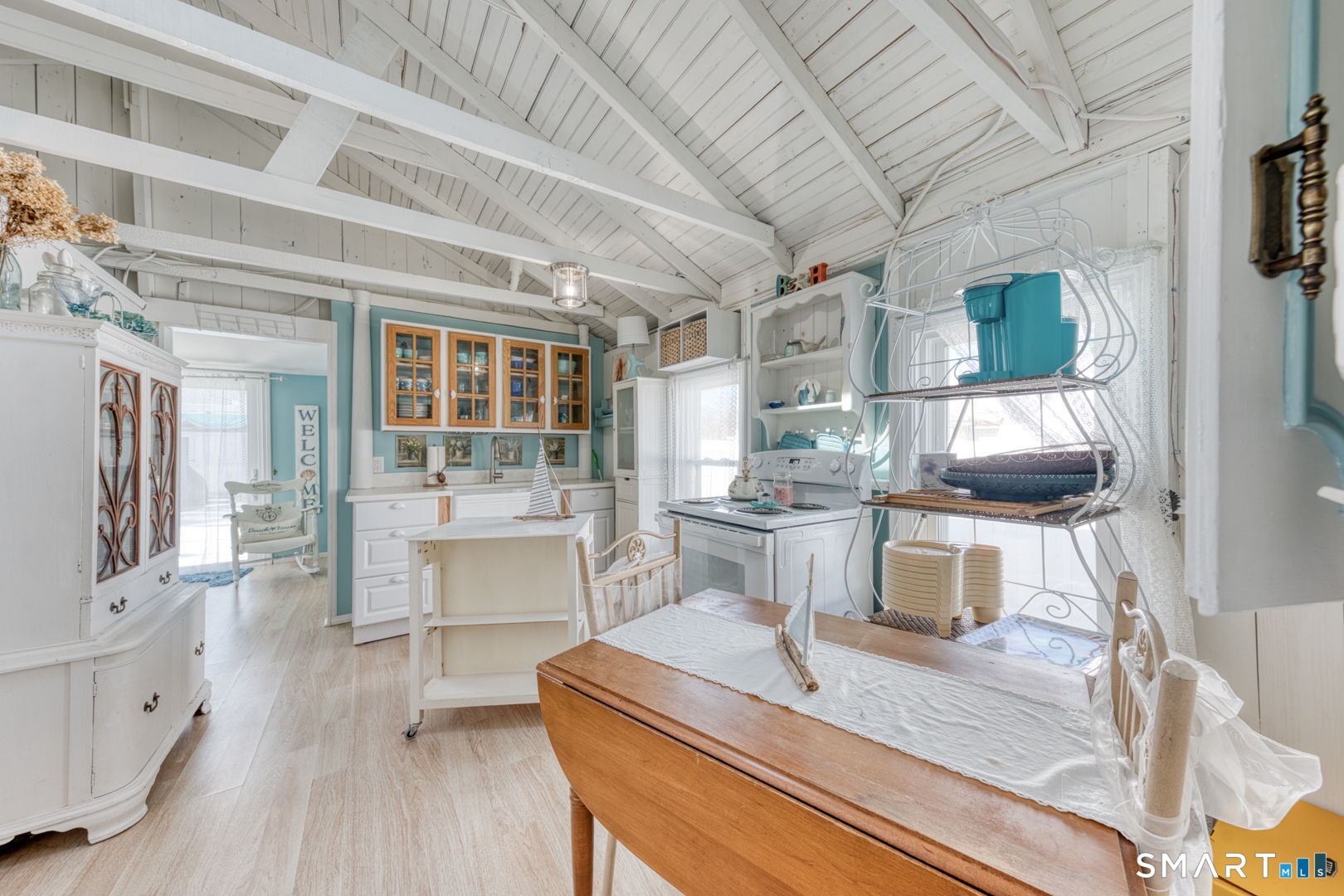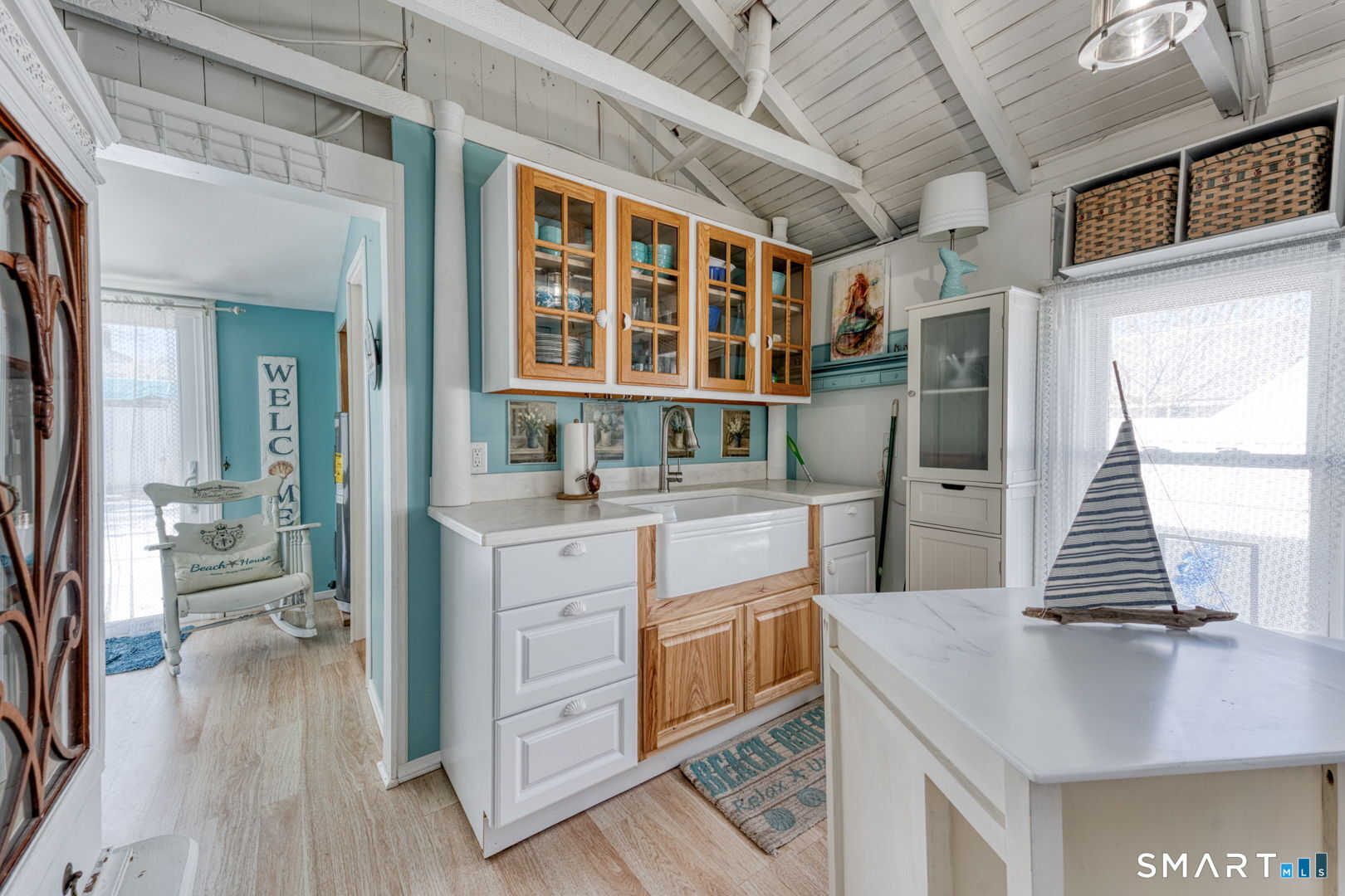 Charming and beautifully updated 4 bedroom cottage in desireable Saybrook Manor beach community. This home offers the perfect blend of character and modern improvements with vaulted ceilings and exposed beams. The completely remodeled kitchen features Corian countertops, a classic farmhouse sink, skylight for natural light and matching rolling kitchen cart for added prep and storage space. The renovated bathroom includes a luxurious rainfall shower head for a spa-like feel. The bright dining room is enhanced by a large new slider that opens to a spacious stone patio-ideal for indoor/outdoor living. The Living room has a skylight offering warmth and brightness for your gatherings. Enjoy summer evenings around the fire pit or rinse off in the outdoor shower with both hot and cold water after a day at the beach and enjoy dining under the pergula watching the sunset. Additional updates include new windows, new plumbing, and updated electrical, offering peace of mind for years to come. A perfect coastal-style retreat with thoughtful upgrades inside and out.