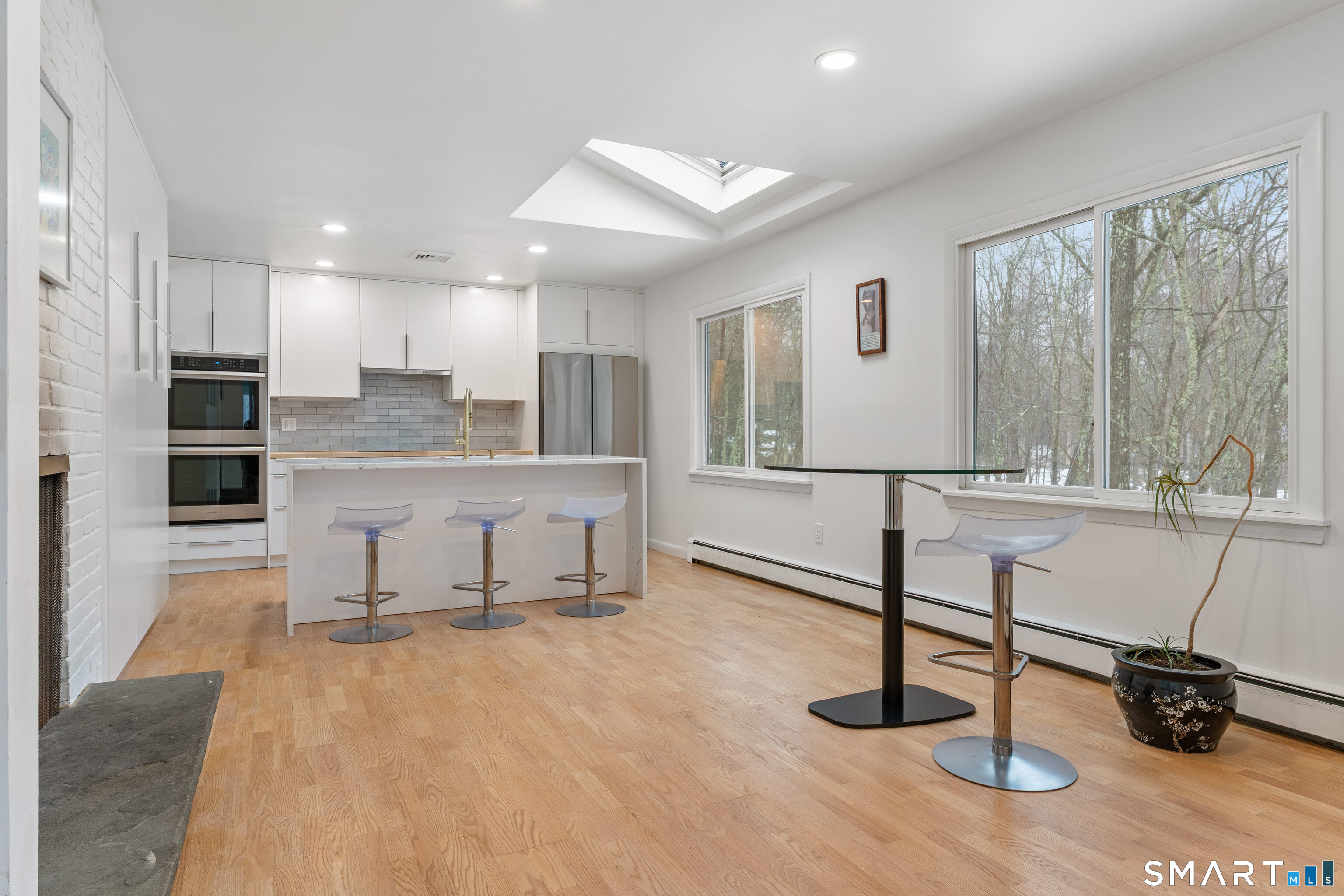 This light-filled contemporary home has been masterfully reimagined and updated. Combining an innovative architectural approach with high-end finishes, this residence offers a sophisticated retreat on 2.27 private acres. The heart of the home is the upper level, featuring a fantastic modern eat-in kitchen flooded with natural light. The adjacent living and dining area is defined by soaring ceilings, expansive walls of windows, and a cozy wood-burning fireplace. From here, step out onto a large, private deck, perfect for indoor-outdoor entertaining against the backdrop of the scenic property. The home's layout is designed for both privacy and connectivity. The primary suite is privately situated at one end of the home, offering you a peaceful oasis. Three additional bedrooms and two fully renovated baths are located on the opposite wing. The lower level boasts high ceilings and includes a large family room with a second fireplace, an additional bedroom with a full bath, a dedicated office, and a laundry room. It also provides direct access to the two-car garage. Nestled on a level cul-de-sac lot in Lower Weston, the property features a scenic pond and borders open space, ensuring lasting privacy.