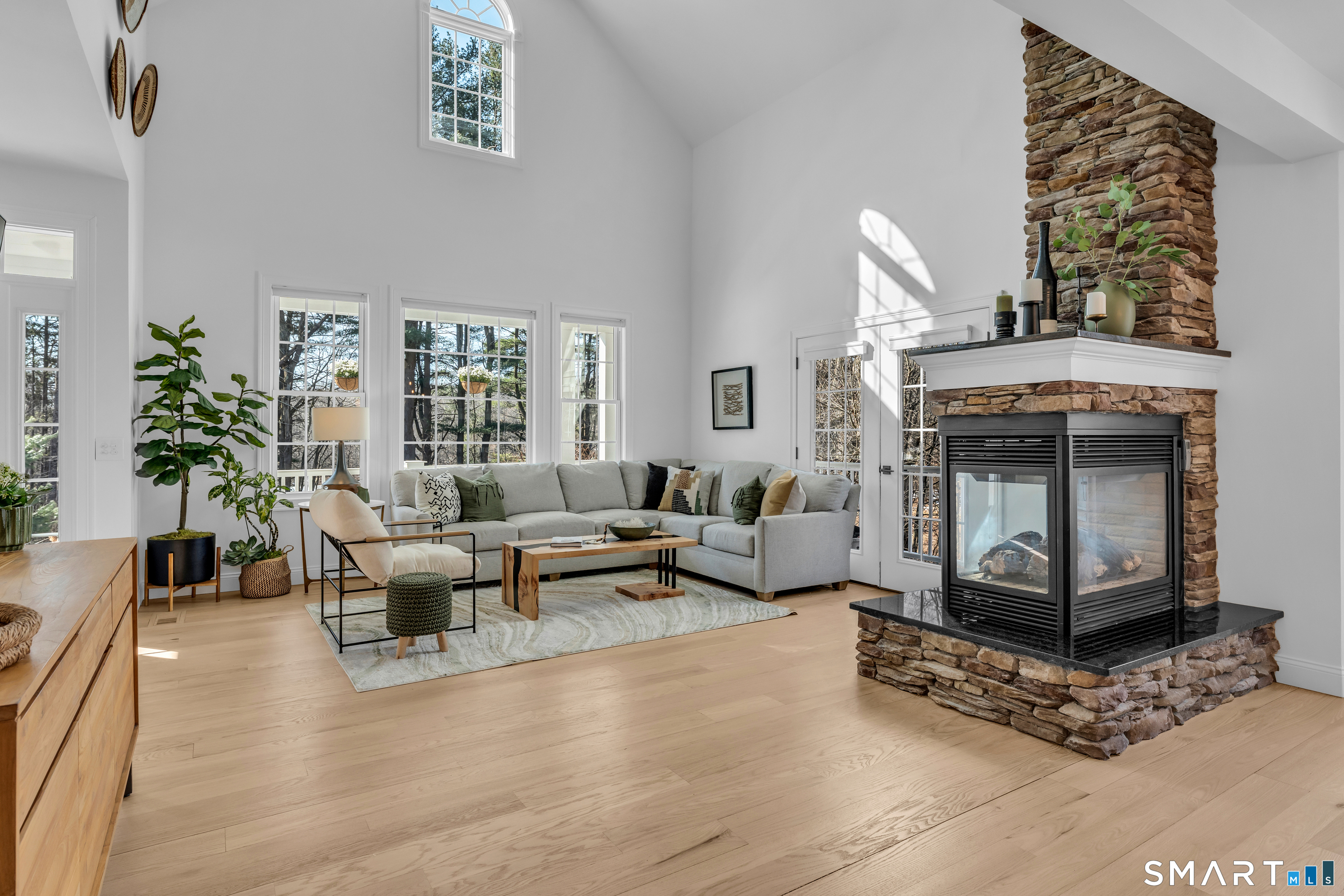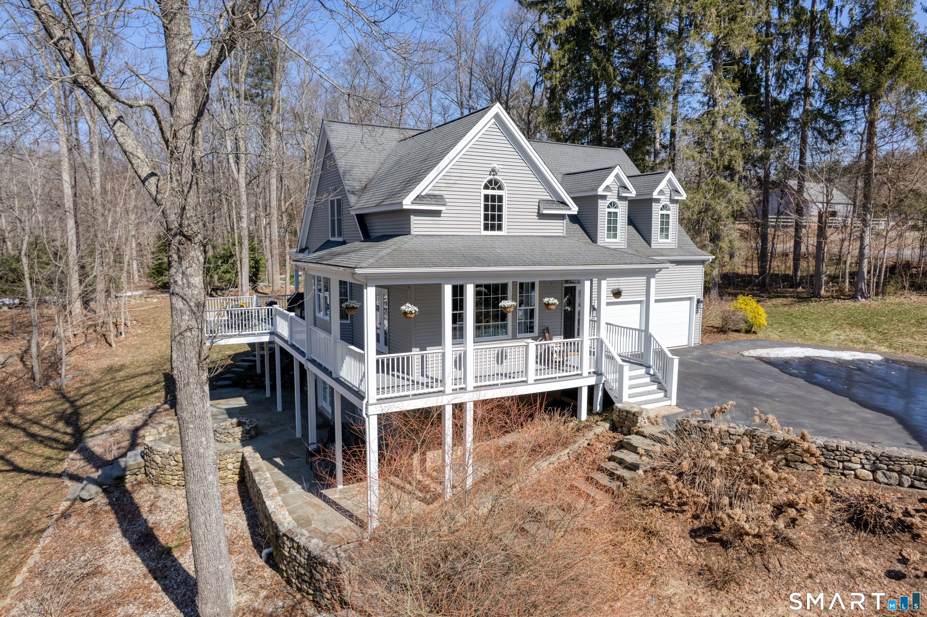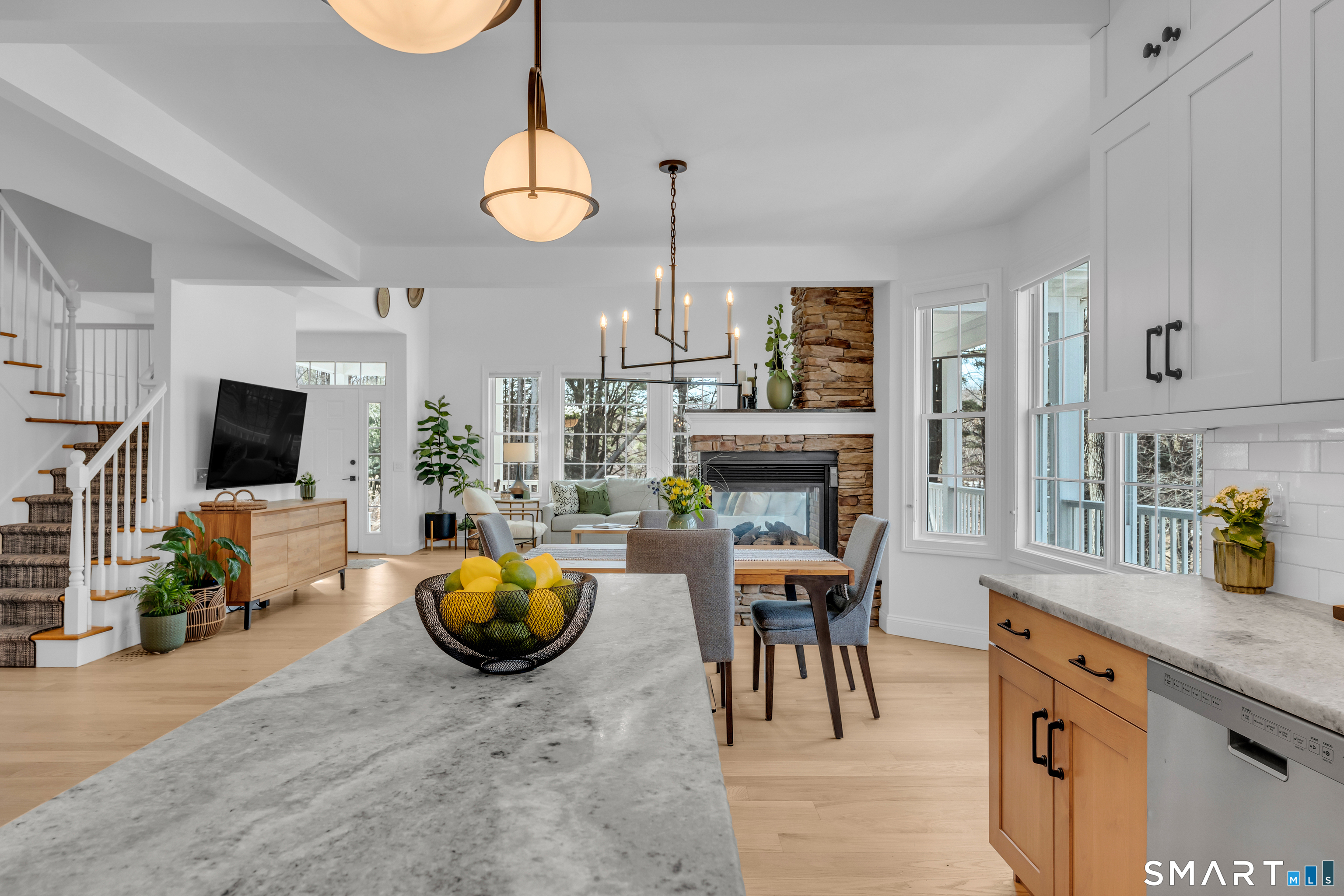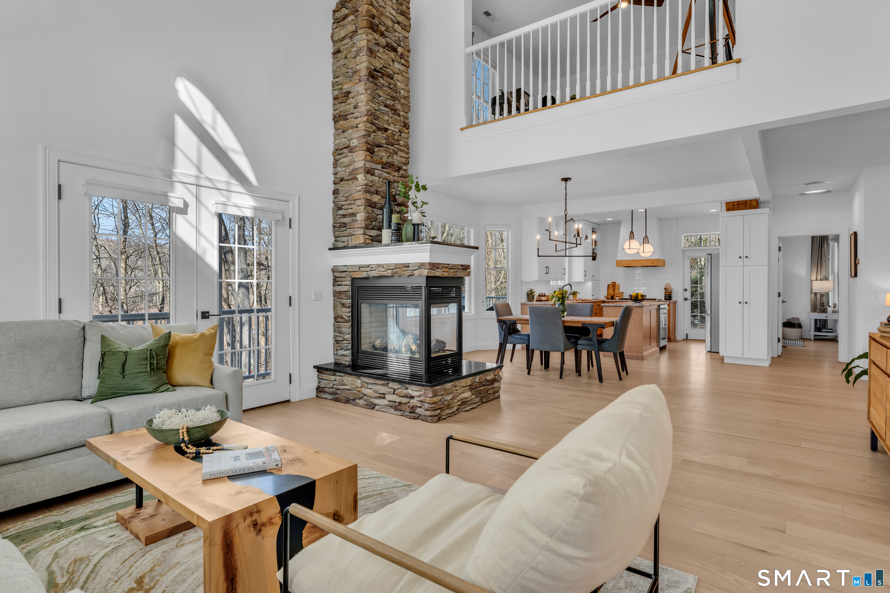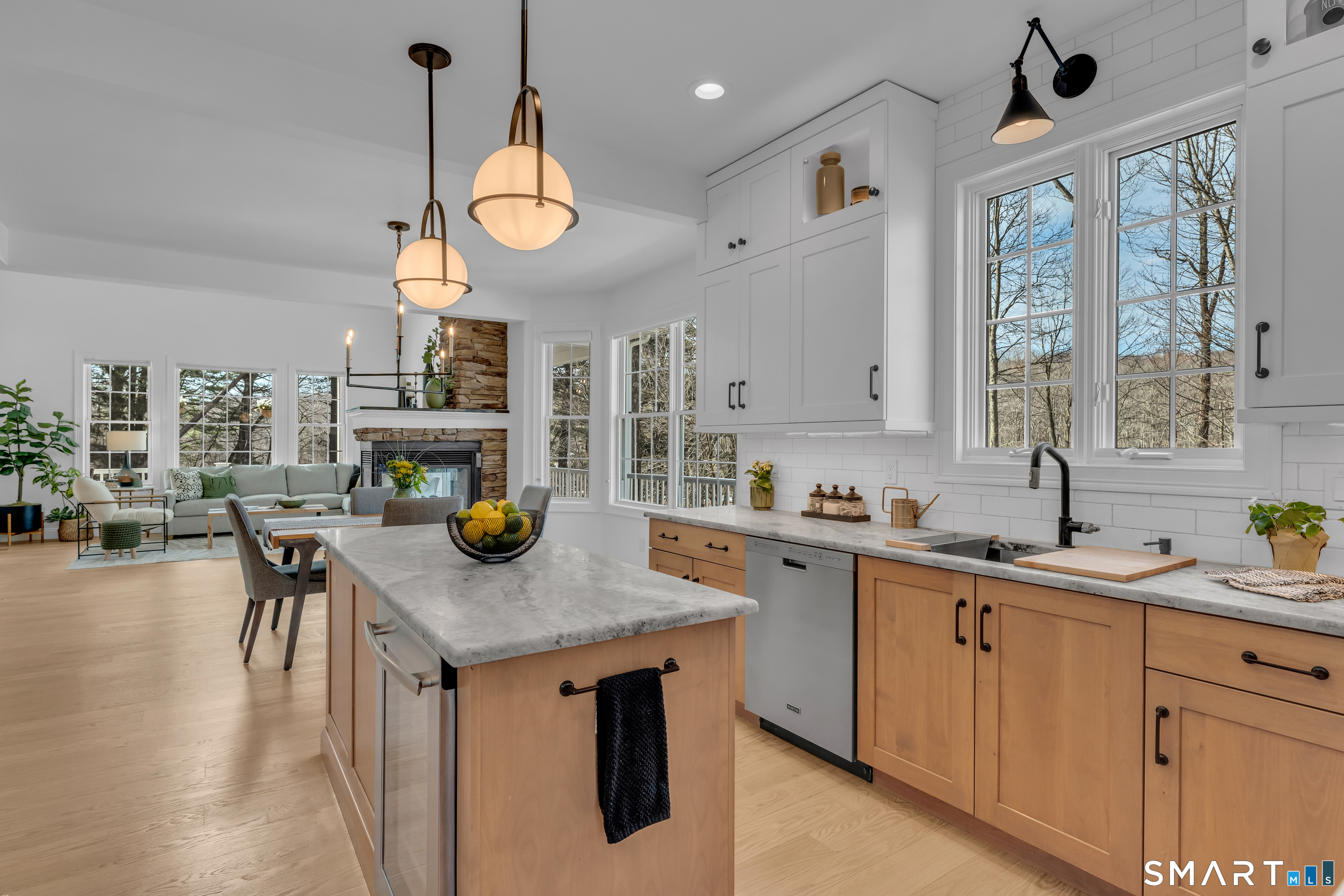 Prepare to fall in love with this exquisite home, fully remodeled in 2021-2024 with no expense spared. Every inch reflects exceptional craftsmanship, from high-end materials and custom cabinetry to designer tile, premium lighting, and brand-new mechanicals, including a new furnace and AC condenser. Step inside to a breathtaking open-concept living space anchored by a dramatic 3-sided stone fireplace. The thoughtfully designed kitchen-with a chef's sink, integrated accessories, double oven, and 6-burner gas stove-makes cooking a joy. The first-floor primary suite offers two closets, French doors to the wraparound deck, and a spa-like bath with a walk-in shower and freestanding slipper tub. Upstairs are two generously sized bedrooms, one with charming built-ins and window seats, plus an open loft-style room with shelving currently used as a home office overlooking the family room. The finished lower level is ideal for gatherings, featuring a kitchenette with refrigerator, sink, cabinets, and a bar area that flows seamlessly to the outdoor stone patio. Enjoy the fire pit, multiple seating areas, and views of the professionally landscaped grounds. Mature landscaping, thoughtful hardscaping, and your own private pond create a serene retreat-fish in summer, skate in winter. Set on over 5 acres in the quiet, nature-rich town of Killingworth, this home offers true Connecticut living at its best. Schedule your private showing today.