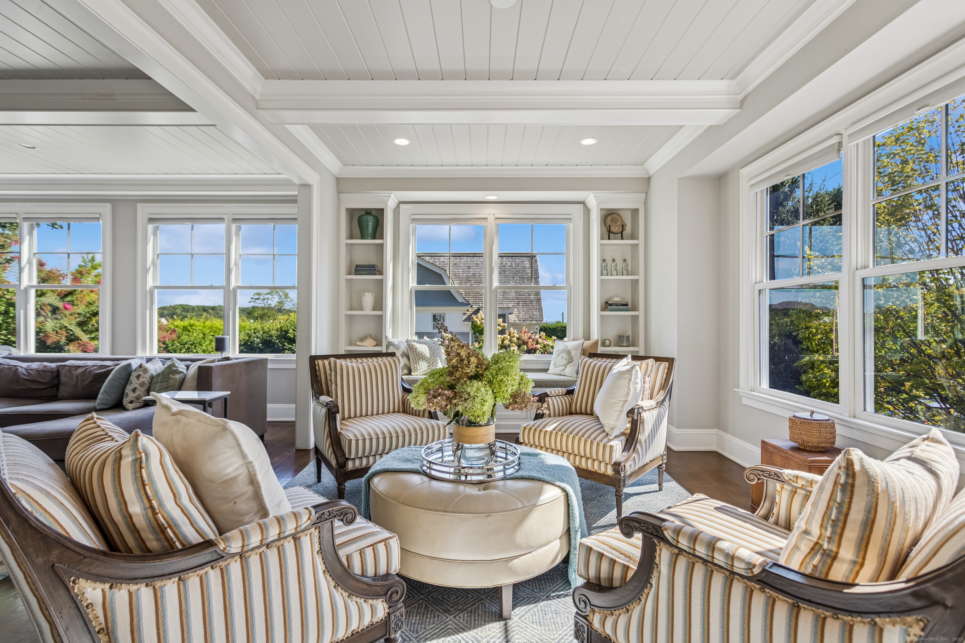 COMPO BEACH WATER VIEWS at this picture-perfect beach house. Edgewater Hillside is the best-kept secret at Compo Beach, a private Hamptons-style cul de sac where each home is prettier than the next and water views abound. This exceptional residence combines timeless design with high-end amenities and so much space to live and entertain, walking distance to Compo Beach and Old Mill Beach, and moments to Longshore Club Park's golf, tennis, swimming and boating, and downtown. The four beautifully-finished levels are highlighted by so much attention to detail: soaring coffered ceilings, built-ins, and oversized windows taking in the views of the Sound, the Mill Pond and walls of blooming hydrangea. A chef's dream kitchen is equipped with Viking and Subzero appliances, and a fully-equipped outdoor kitchen and stunning stone fireplace make entertaining a breeze in all seasons. The generously-sized primary suite offers a sumptuous bath with soaking tub, walk-in closet and gas fireplace. The versatile floor plan includes a third floor retreat also with jaw-dropping views, balcony and full bath. The fully finished lower level also includes a full bath. The home and road access are not in a flood zone, and city water, sewer and natural gas plus a whole-house generator make life easy. Enjoy privacy, water views and the lifestyle only Compo Beach offers. Even room for a small pool! Also available fully furnished for a turnkey beach residence!