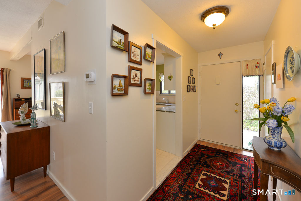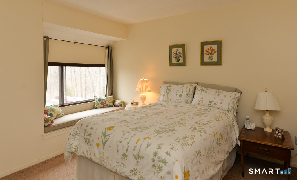 Fantastic opportunity at this one-bedroom Carriage House in 55+ Heritage Village. The home enjoys lots of natural light and offers a remodeled kitchen with white cabinets and granite counters. The living and dining areas feature wide board engineered flooring and are focused on a wood burning fireplace. Through the slider is a brand-new deck! The bedroom is close to the full bath which was renovated with an all new shower in 2024. Efficient heat pump HVAC installed in 2023. From the deck enjoy a peek at a nearby pond.