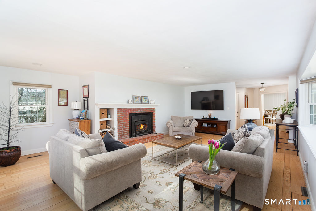 **Final Offers Due Tuesday 3/31 at 8PM.** Welcomed by a circular driveway that can accommodate several cars, this charming 3-bedroom, 2 full bath ranch sits on a picturesque, park-like property, offering the ease of one-level living. The welcoming entry foyer is flanked by a spacious living room featuring wide-plank hardwood floors, a wood stove, and a large picture window showcasing the beautiful surroundings, and an oversized dining room with a vaulted ceiling, ceiling fan, and wood-burning fireplace. The dining area flows seamlessly into the recently renovated kitchen, complete with quartz countertops, stainless steel appliances, subway tile backsplash, under-cabinet lighting, and a breakfast counter. All three bedrooms include ceiling fans for added comfort. A walk-up attic and a full, unfinished basement provide abundant storage. Enjoy the screened-in three-season sunroom and Trex deck, perfect for relaxing or entertaining. The peaceful setting is enhanced by a creek and a pond, while a stamped-concrete walkway leads to the front entrance. A detached two-car garage completes this special property. Recent updates include: wood-burning stove (2014), double-pane windows (2015), roof (2016), Trex deck (2017), garage doors (2017), bathroom (2019), central air (2021), furnace (2021) hot water heater (2021), kitchen (2021), stamped concrete walkway (2022), refinished hardwood floors (2022), washer and dryer (2022), and dishwasher and refrigerator (2022).